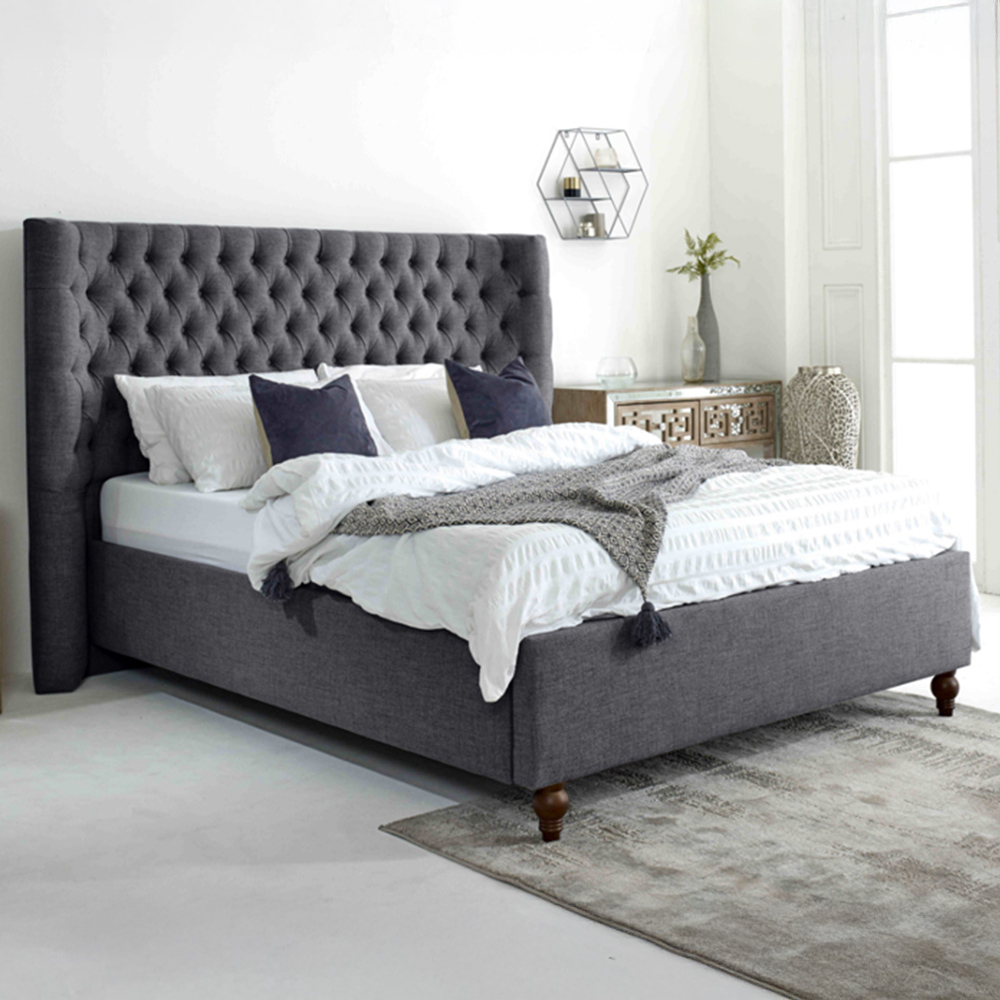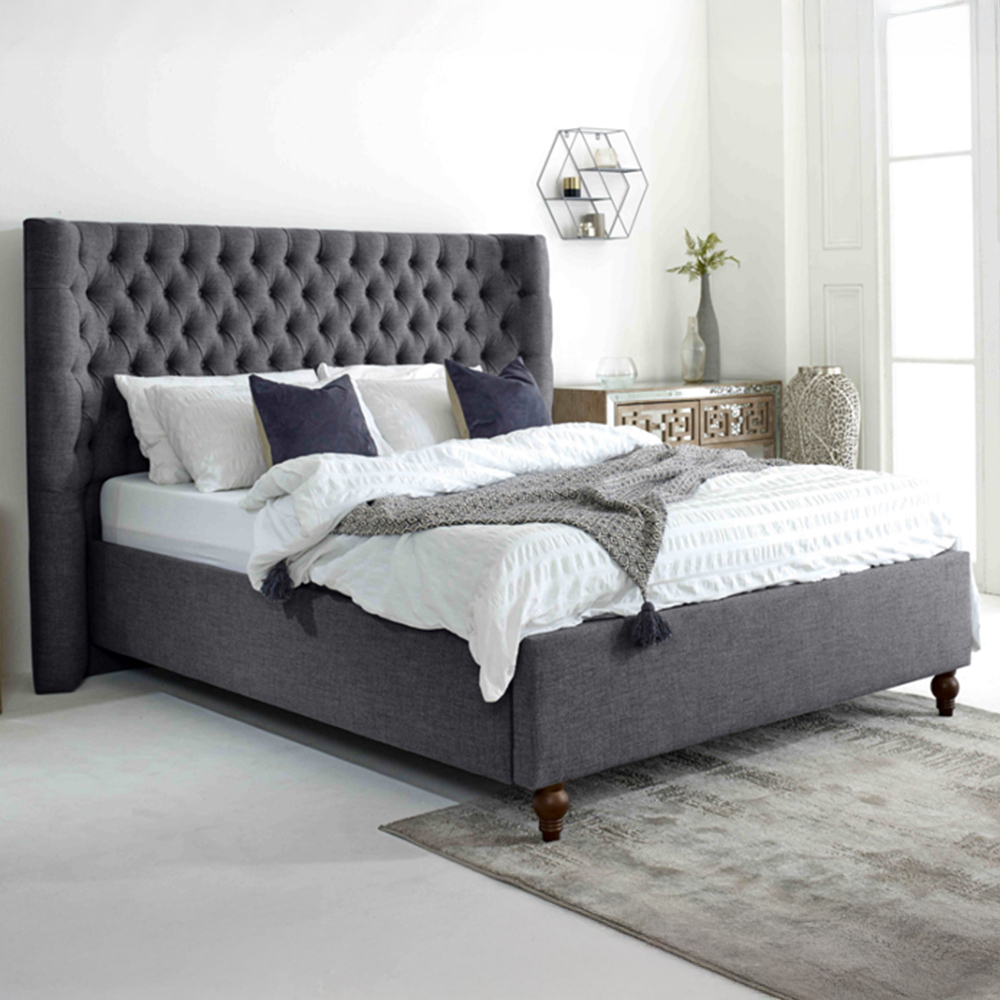 Introducing the Dinah Grampian Fabric Bed Frame, a perfect fusion of style and comfort designed to elevate your bedroom decor. Made in Britain with exceptional craftsmanship, this bed frame is comes in elegant Grampian fabrics, ensuring it complements any interior. The striking winged headboard design adds a touch of grandeur and sophistication, making it a stunning centerpiece for your bedroom. Experience superior quality and timeless elegance with the Dinah Grampian Fabric Bed Frame. Transform your sleep sanctuary and indulge in ultimate luxury.
