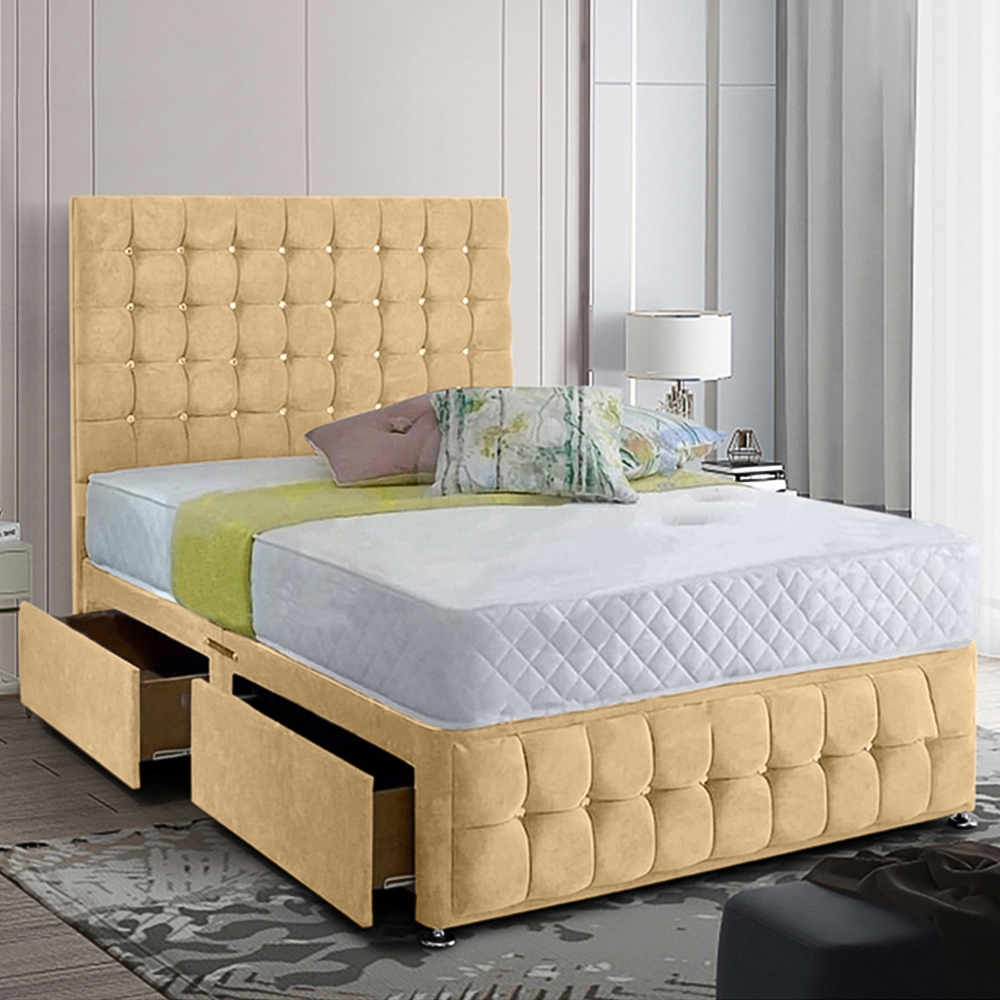 Elevate your sleeping experience with the Eleganza Home Cloudrest Super King Size Beige Plush Velvet 2 Drawer Divan Bed with Headboard, a masterpiece of luxury and practical design. This divan bed is not just a piece of furniture, but a statement of style, featuring a 54-inch headboard with shimmering diamante buttons that instantly add a touch of glamour to your bedroom. The plush velvet fabric complements the cubed design, providing a contemporary look while the two spacious drawers offer a smart storage solution, keeping your space tidy and elegant.