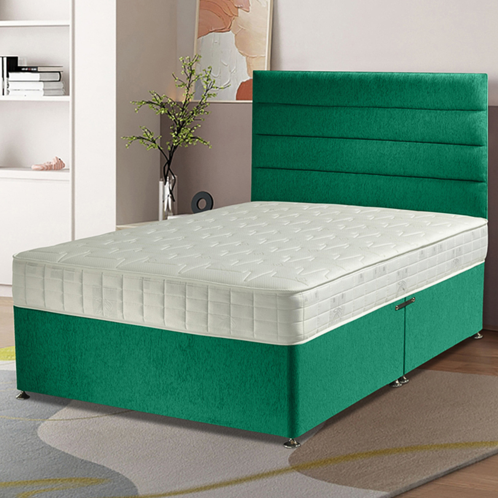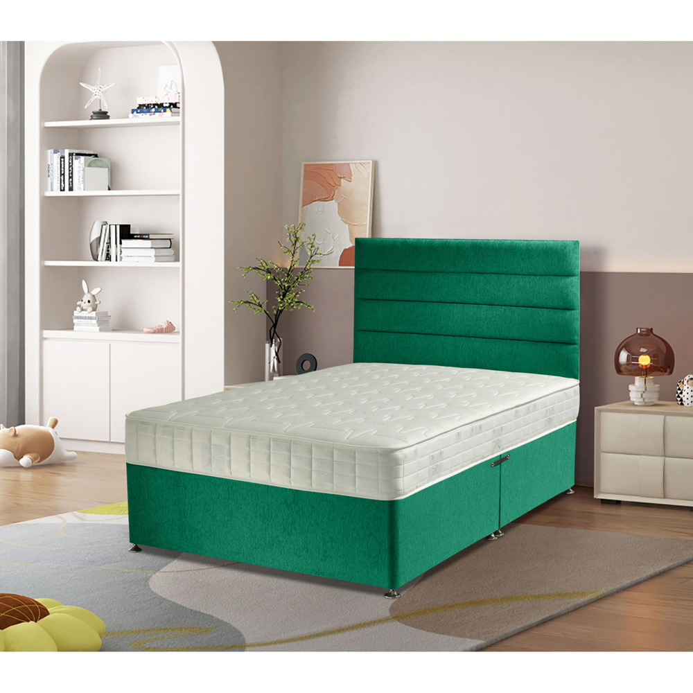 Experience unmatched comfort paired with sleek style in your bedroom with the Dozer Divan Bed. This super king size plush emerald divan bed features a striking 54-inch headboard, adorned with a lined design that exudes a modern and polished look. Handcrafted in the UK, the bed is upholstered in luxurious plush velvet, ensuring both durability and a touch of elegance. Ideal for those who value sophisticated design and superior comfort, the Dozer Divan Bed transforms any bedroom into a lavish retreat.