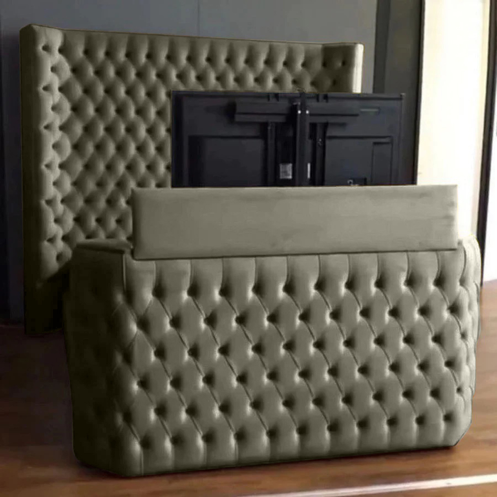 Introducing the Elisa Plush Velvet TV Bed Frame—a masterpiece of British craftsmanship that seamlessly blends opulence and innovation. Immerse yourself in the lap of luxury with plush velvet, enhanced by meticulously matched fabric buttons and a distinctive curved winged headboard that adds a touch of sophistication to your sanctuary. Indulge in the perfect fusion of style and technology with the built-in remote, offering effortless control of your TV. Designed for the modern connoisseur, the Elisa Plush Velvet TV Bed Frame accommodates screens from 40" to 75". Worried about compatibility? Worry not! With VESA 600×400 or less mounting holes, this bed frame effortlessly marries form and function, transforming your bedroom into a haven of elegance and entertainment. Elevate your living space with Elisa—where premium quality meets timeless style.