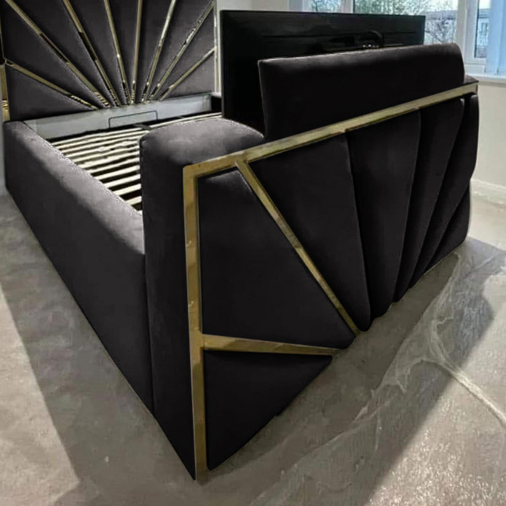 Introducing the Leniva Plush Velvet TV Bed Frame—a masterpiece of British craftsmanship that redefines luxury and style. Immerse yourself in the lavish comfort of plush velvet, adorned with a touch of opulence through gold metal trim on the headboard and footboard, adding a glamorous flair to your bedroom. Experience the perfect fusion of sophistication and convenience with the built-in remote, effortlessly enhancing your TV-viewing experience. The Leniva invites you to customise your space, allowing you to indulge in personalised elegance. Designed for the modern lifestyle, the Leniva Plush Velvet TV Bed Frame accommodates screens from 40" to 75". Worried about compatibility? Fear not! With VESA 600 x 400 or less mounting holes, this bed frame effortlessly combines aesthetic allure with technological prowess, transforming your bedroom into a haven of comfort and entertainment. Elevate your living space with Leniva—where premium quality meets lavish design.