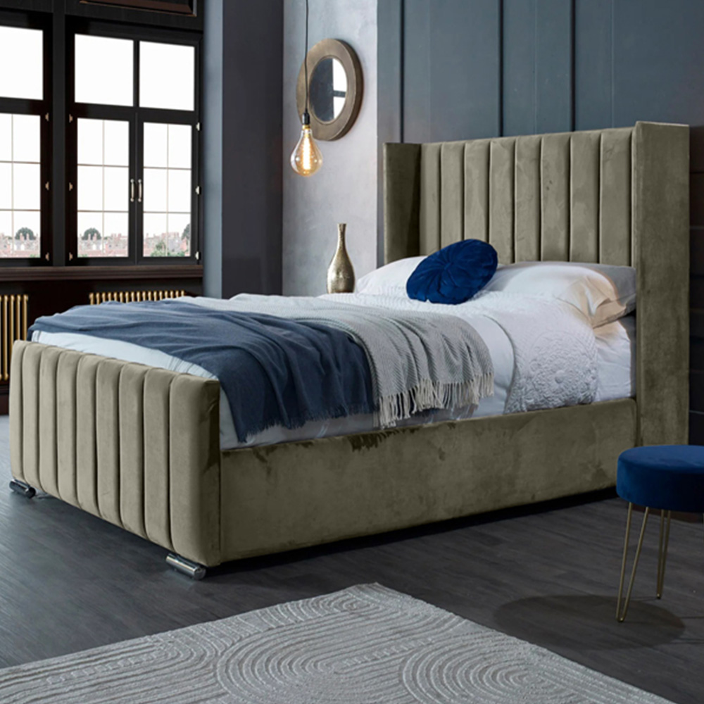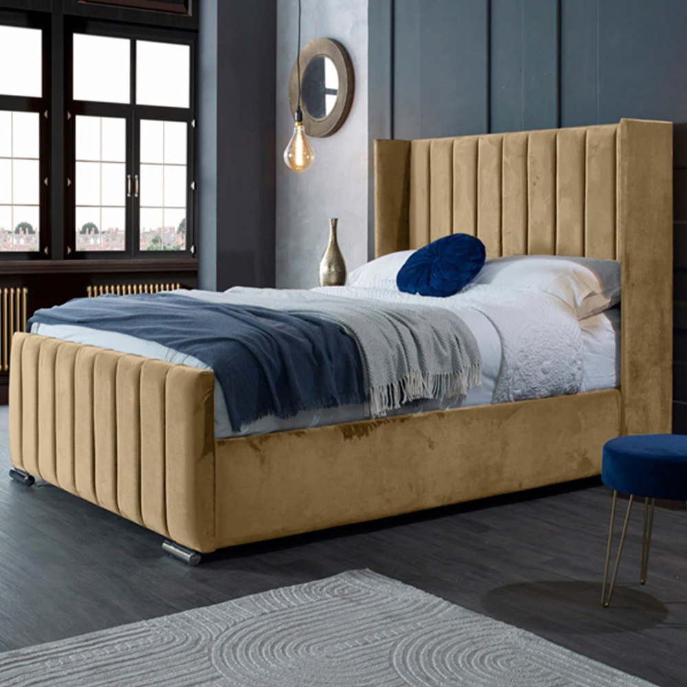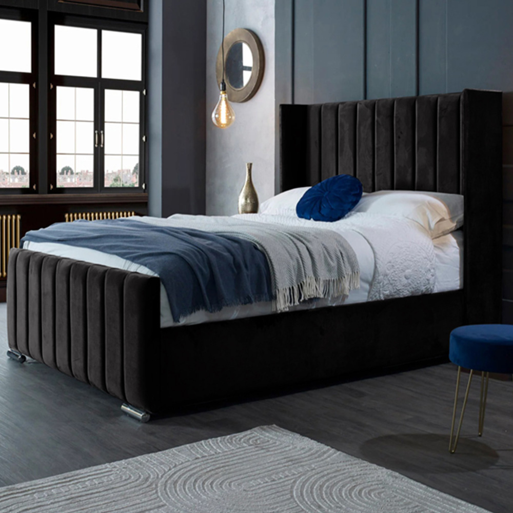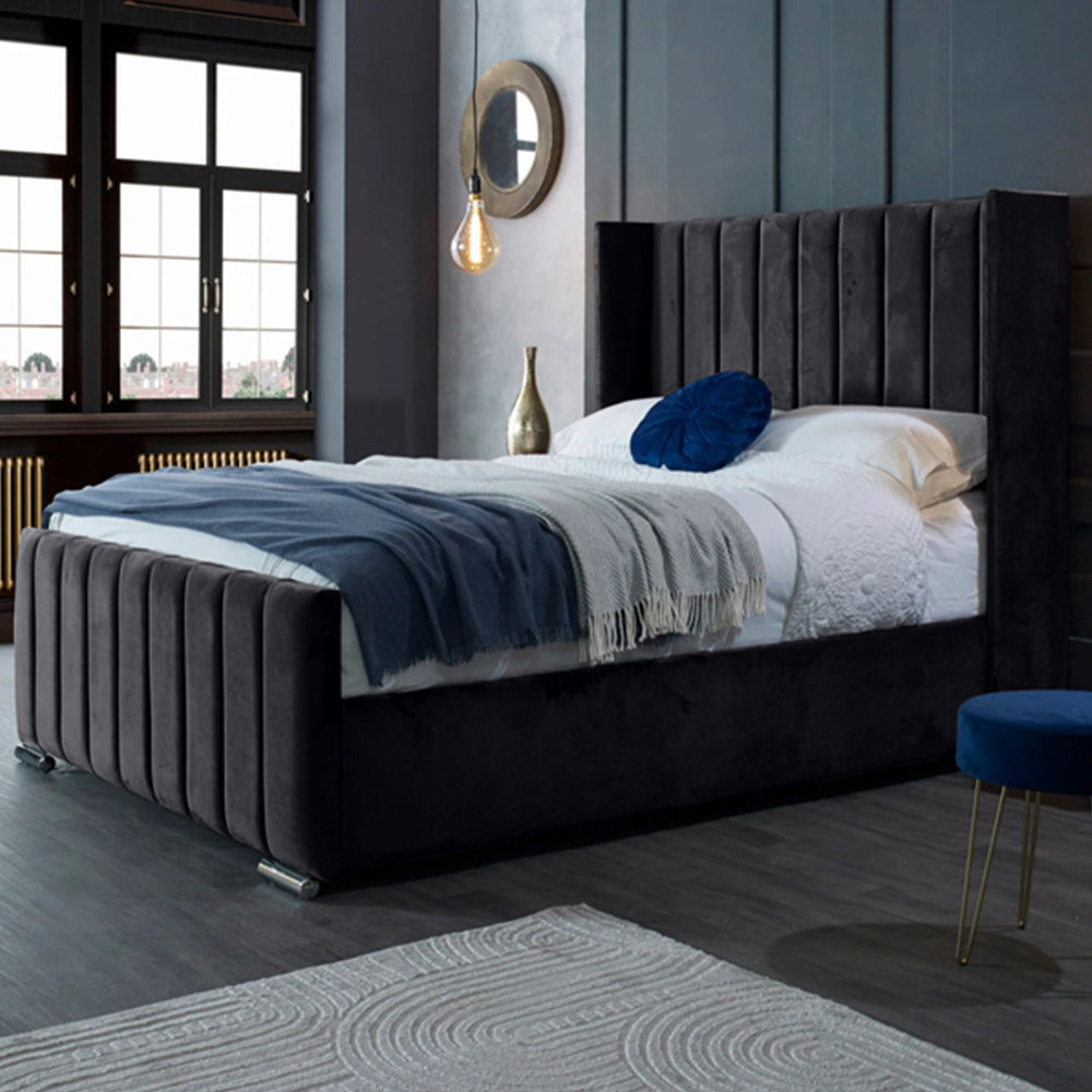 Introducing the Meriso Plush Velvet Bed Frame—a pinnacle of British craftsmanship and contemporary elegance. Immerse yourself in premium quality with plush velvet, featuring a majestic winged headboard adorned with a sleek lined design. Experience the perfect blend of style and comfort with this sophisticated piece. The Merison invites you to personalise your space with a spectrum of colours, creating a bespoke retreat that exudes modern allure. Crafted for those with a discerning taste, the Merison Plush Velvet Bed Frame is a statement of refined elegance in any bedroom. Elevate your living space with this chic design—where premium quality meets contemporary sophistication in a harmonious embrace, setting the stage for a truly luxurious sleep sanctuary.