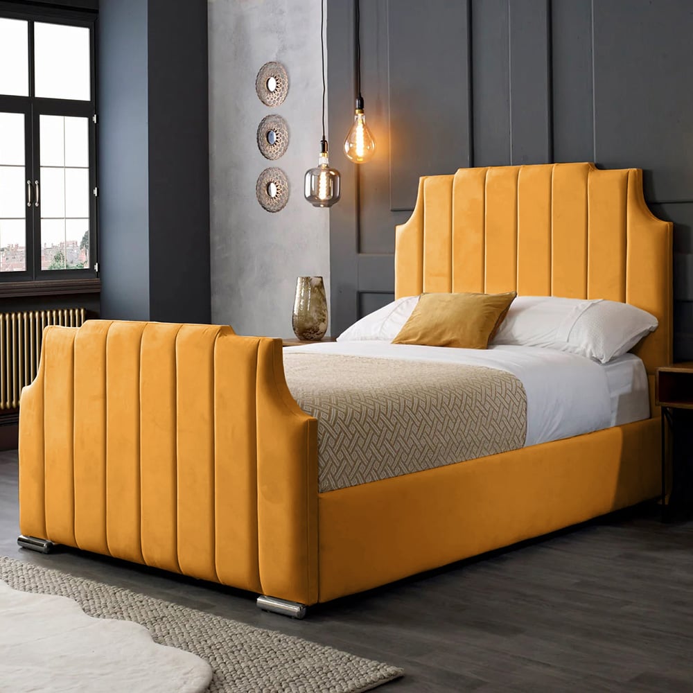 Introducing the Nelson Plush Velvet Bed Frame—a celebration of British craftsmanship and contemporary design. Immerse yourself in premium quality with plush velvet, featuring a sleek headboard adorned with a distinguished lined design, coupled with a unique step headboard and footboard design. Experience the perfect fusion of style and comfort with this modern masterpiece. The Nelson invites you to customise your space with a spectrum of colours, creating a bespoke retreat that exudes luxurious allure. Crafted for those who appreciate the extraordinary, the Nelson Plush Velvet Bed Frame is a statement of refined elegance in any bedroom. Elevate your living space with this chic design—where premium quality meets cutting-edge style in a harmonious embrace, setting the stage for a truly indulgent sleep sanctuary.