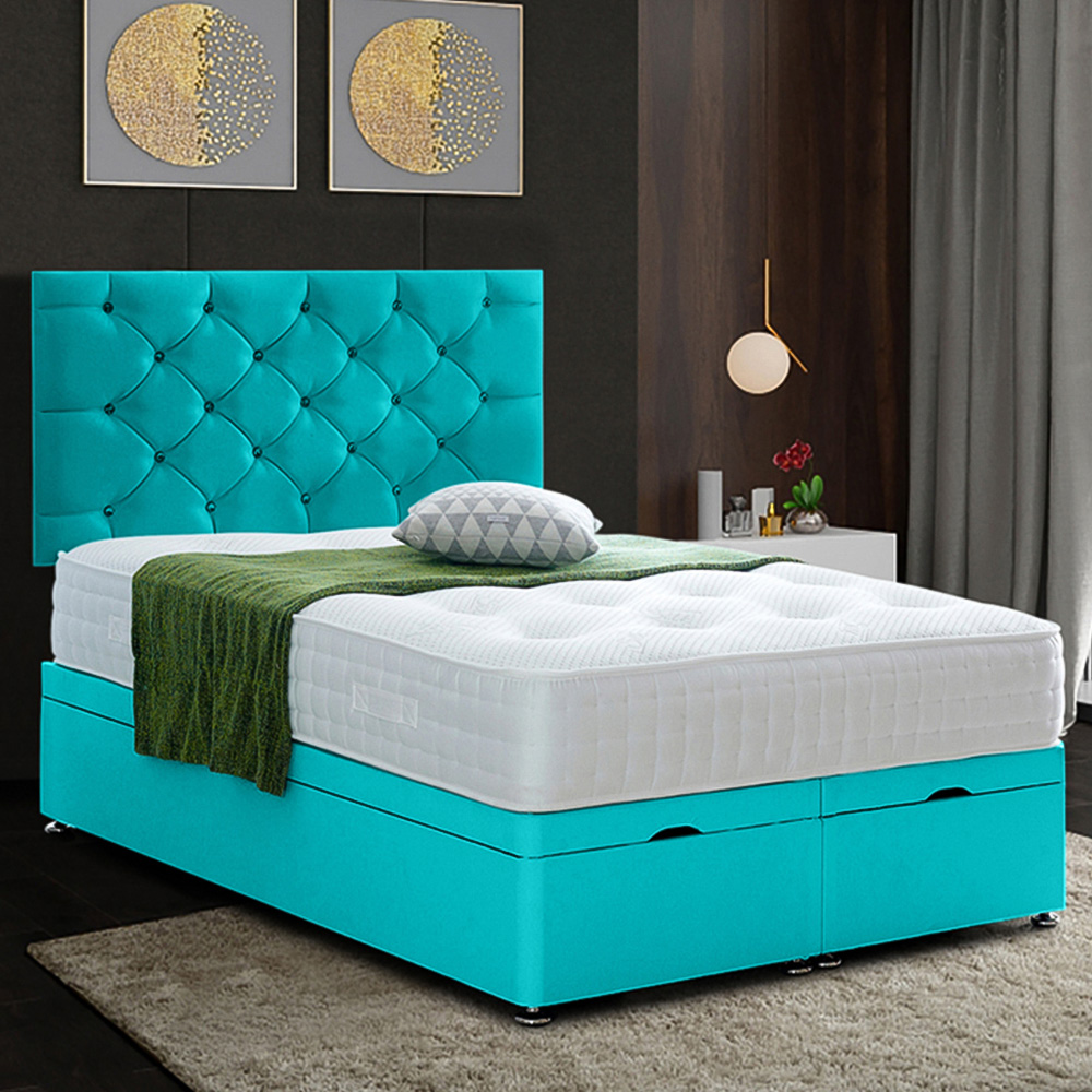 Elevate your sleeping experience with the Eleganza Home Resthaven Single Teal Plush Velvet Divan Ottoman Bed with Headboard, a perfect blend of elegance and functionality. This bed features a luxurious 24 inch Chesterfield headboard and an ottoman base, both meticulously upholstered in plush velvet. The built-in storage within the ottoman base makes it an ideal choice for those looking to maximise space without compromising on style. This bed is designed to complement any bedroom decor while providing a touch of sophistication.