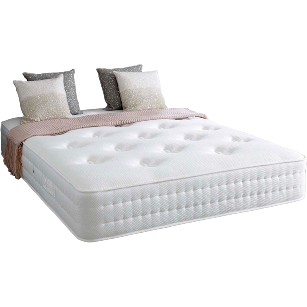 1000 pocketed spring system. 11-inch deep mattress. Two sided luxury knitted fabric with sculpture quilt top contemporary finish. Polyester fillings increase breathability. Handles and vents. Medium firm feel.