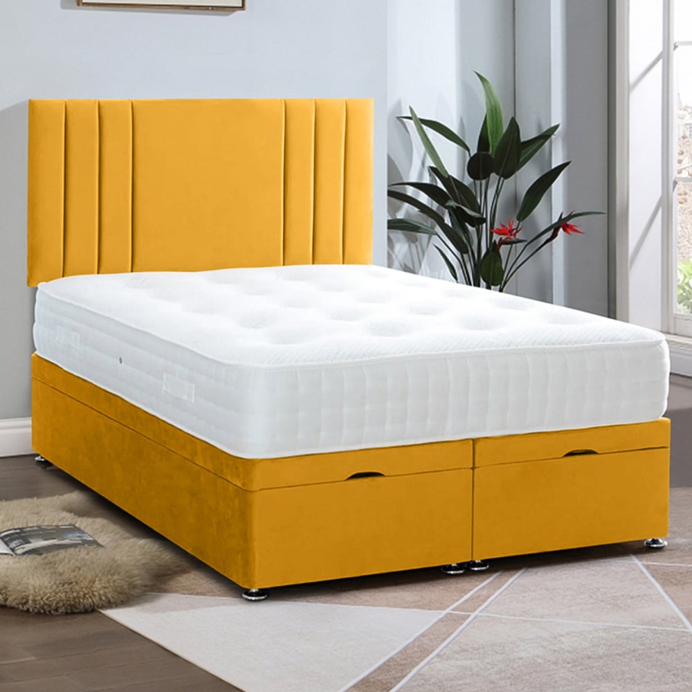 Experience unparalleled comfort and elegance with the Slumberlyn Divan Bed, a masterpiece that combines a chic Ottoman design with mustard plush velvet fabrics. This king size bed features a striking 54-inch headboard, adorned with an elegant lined pattern that adds a contemporary touch to any bedroom. The integrated ottoman storage cleverly maximises space, providing a neat solution to store away essentials. Wrapped in luxurious plush blush velvet, this bed not only offers a sumptuous feel but also enhances the room with its sophisticated aesthetic.