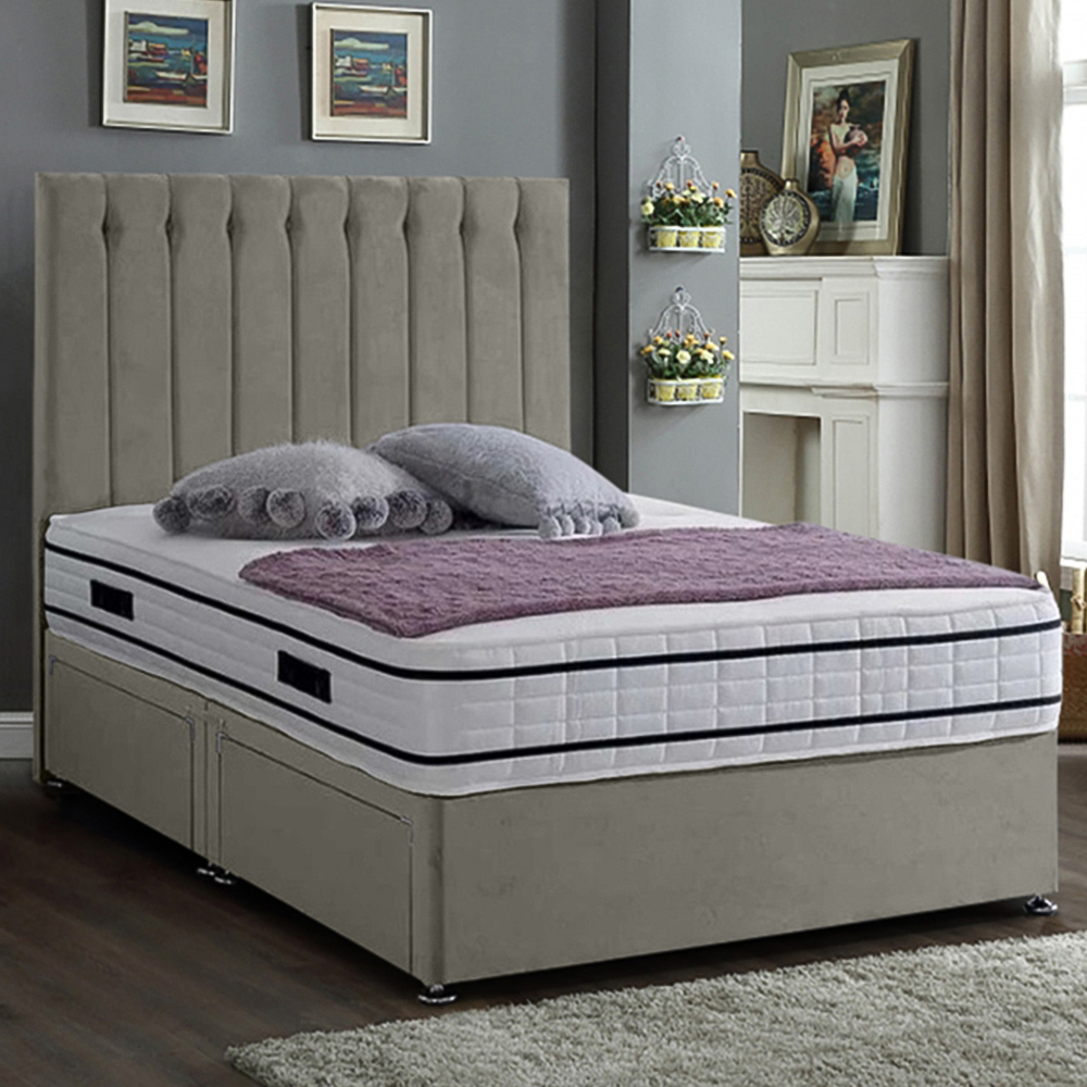 Transform your bedroom into a haven of style and convenience with the Snuggler Divan Bed. This double plush grey divan bed features a striking 54-inch headboard with a sophisticated lined design, combining contemporary flair with essential functionality. Upholstered in luxurious plush velvet, it integrates two spacious drawers, perfect for stowing away linens and other items, keeping your space tidy and serene. Handcrafted in the UK, this bed promises durability, comfort, and a touch of elegance, making it an ideal choice for anyone looking to enhance their sleeping environment.