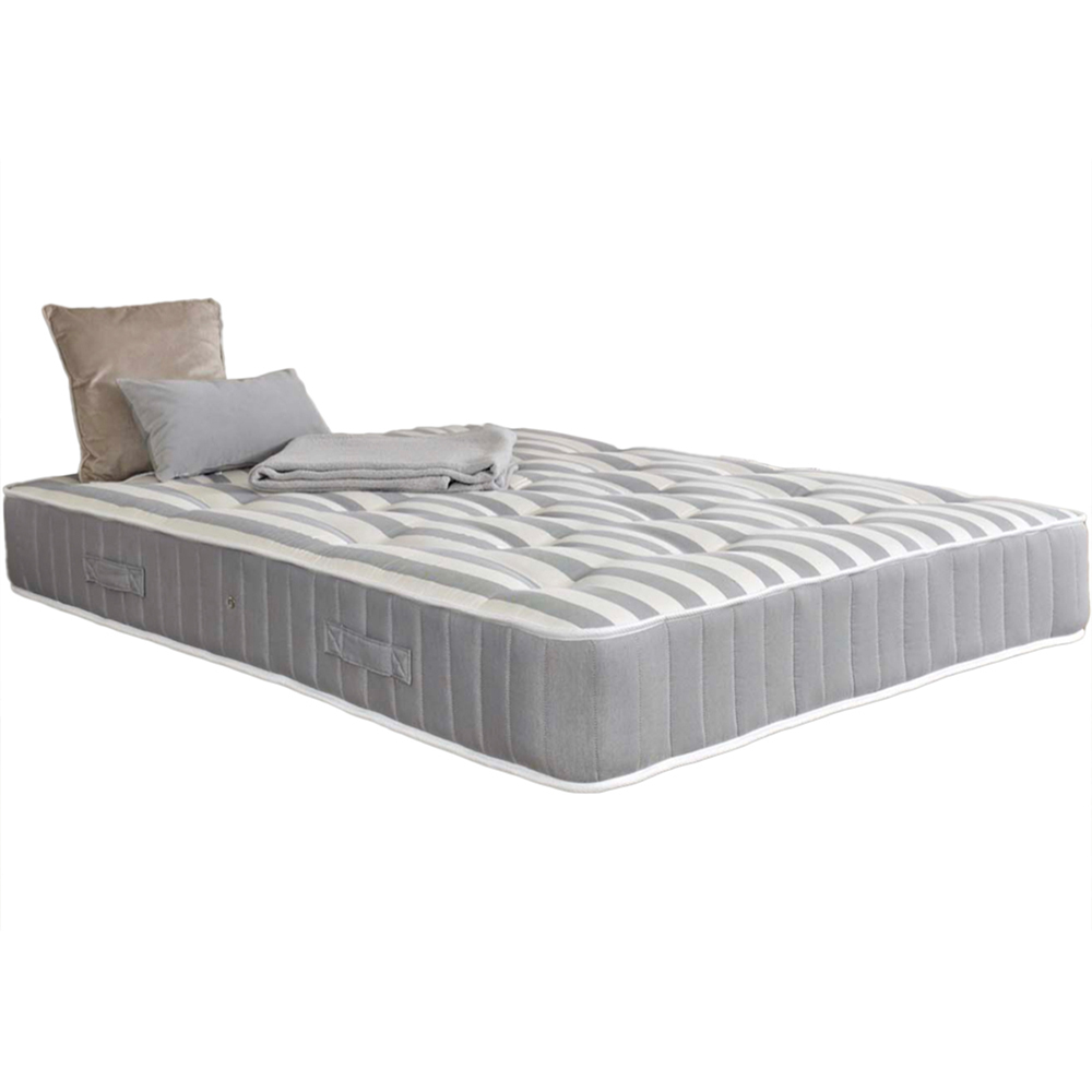 1000 pocket spring system. 10-inch mattress. Two sided modern stripe fabric. Dual density fillings for superior comfort while maintaining firmness. Tufted. Handles and vents. Medium firm feel.