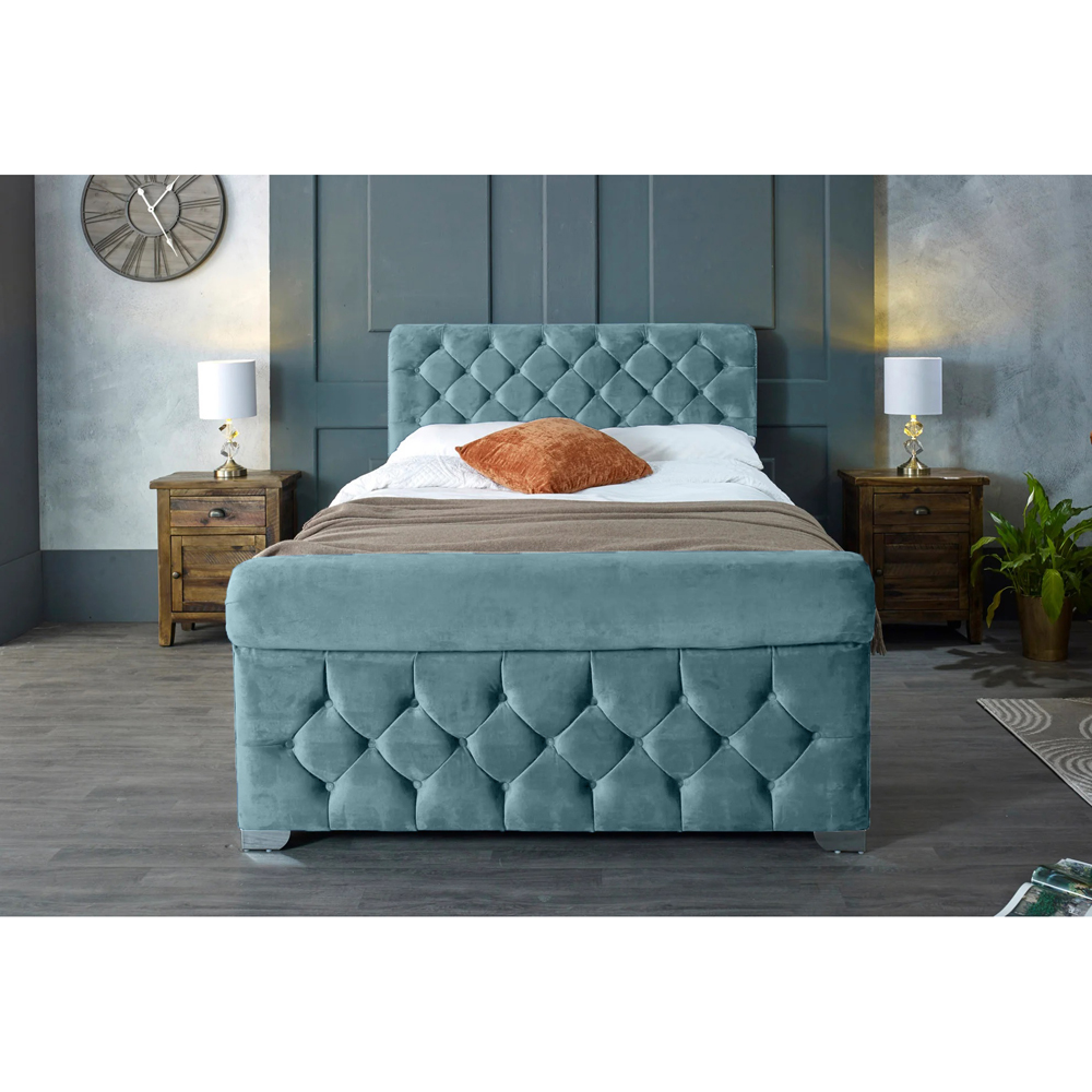 Introducing the Veneta Plush Velvet Bed Frame—a fusion of British craftsmanship and timeless allure. Immerse yourself in premium quality with plush velvet, featuring a classic scroll chesterfield design adorned with intricate beading across the headboard and footboard. Experience the perfect marriage of style and sophistication with this regal piece. The Veneta invites you to customise your space with a spectrum of colours, creating a bespoke retreat that exudes opulence. Crafted for those with a discerning taste, the Veneta Plush Velvet Bed Frame is a statement of refined elegance in any bedroom. Elevate your living space with this chic design—where premium quality meets classic charm in a harmonious embrace, setting the stage for a truly indulgent sleep sanctuary.