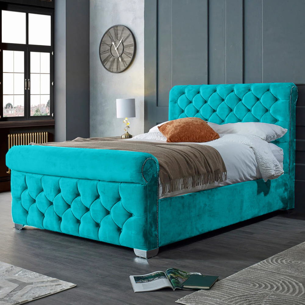 Introducing the Veneta Plush Velvet Bed Frame—a fusion of British craftsmanship and timeless allure. Immerse yourself in premium quality with plush velvet, featuring a classic scroll chesterfield design adorned with intricate beading across the headboard and footboard. Experience the perfect marriage of style and sophistication with this regal piece. The Veneta invites you to customise your space with a spectrum of colours, creating a bespoke retreat that exudes opulence. Crafted for those with a discerning taste, the Veneta Plush Velvet Bed Frame is a statement of refined elegance in any bedroom. Elevate your living space with this chic design—where premium quality meets classic charm in a harmonious embrace, setting the stage for a truly indulgent sleep sanctuary.