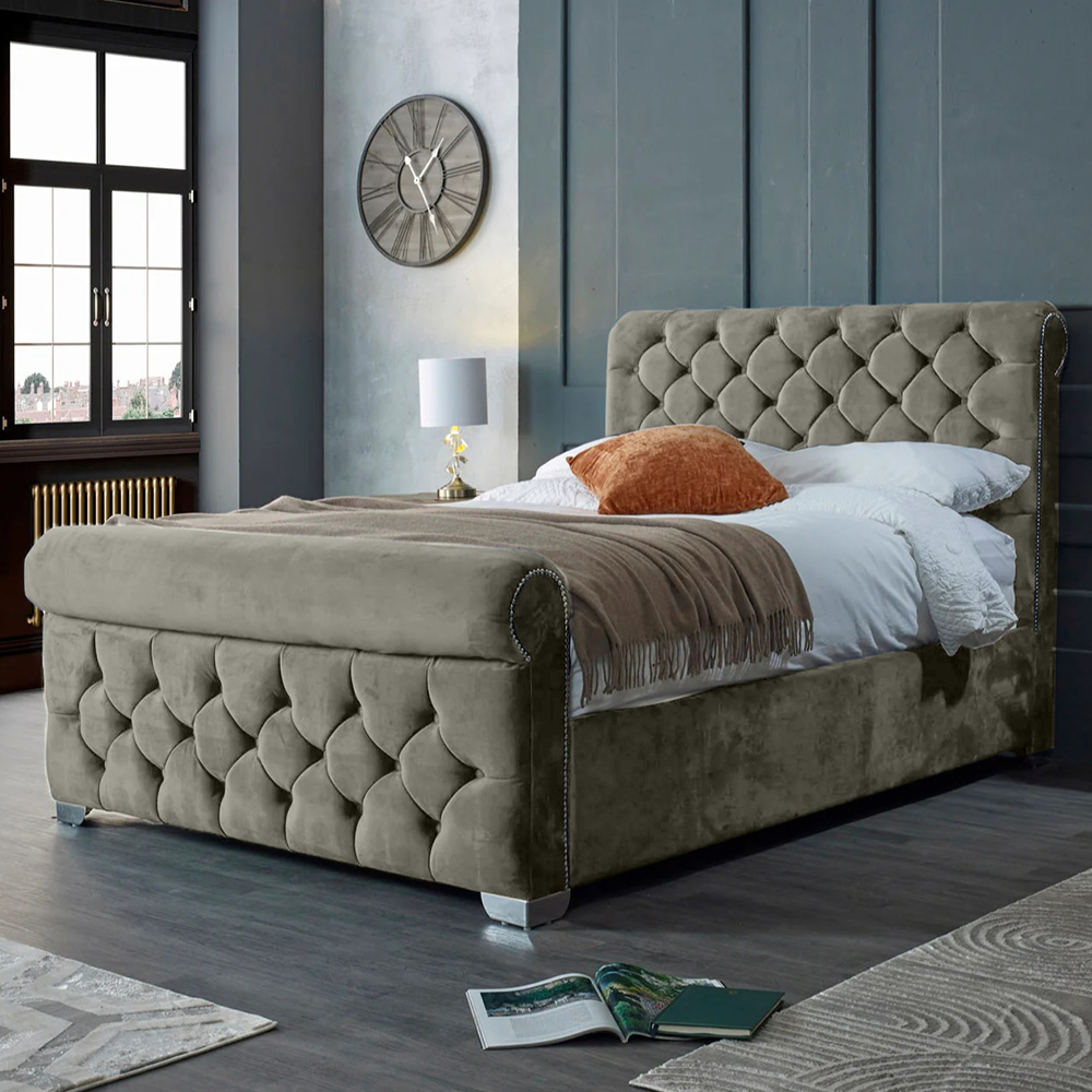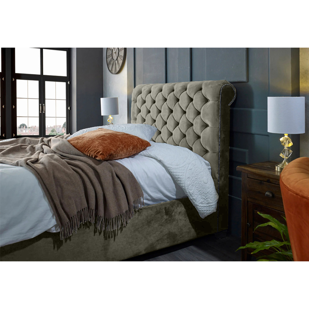 Introducing the Veneta Plush Velvet Bed Frame—a fusion of British craftsmanship and timeless allure. Immerse yourself in premium quality with plush velvet, featuring a classic scroll chesterfield design adorned with intricate beading across the headboard and footboard. Experience the perfect marriage of style and sophistication with this regal piece. The Veneta invites you to customise your space with a spectrum of colours, creating a bespoke retreat that exudes opulence. Crafted for those with a discerning taste, the Veneta Plush Velvet Bed Frame is a statement of refined elegance in any bedroom. Elevate your living space with this chic design—where premium quality meets classic charm in a harmonious embrace, setting the stage for a truly indulgent sleep sanctuary.