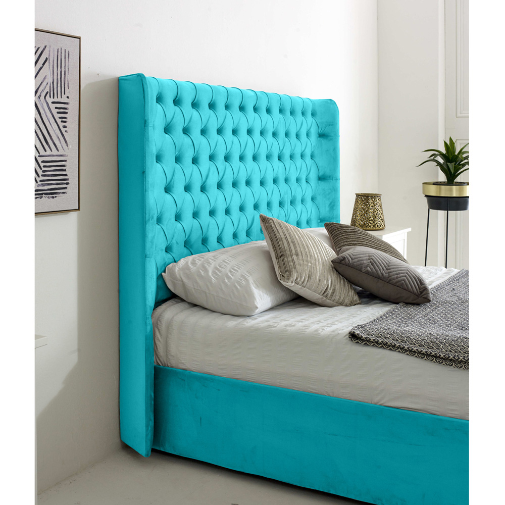Introducing the Woodlake Plush Velvet Fabric Bed Frame, a pinnacle of British craftsmanship and luxury. Made from plush velvet fabric, this bed frame adds a touch of opulence and comfort to any bedroom. The winged Chesterfield headboard design brings classic charm with its sophisticated button detailing and gracefully curved edges. The Woodlake Bed Frame is crafted to fit beautifully in any room. Elevate your bedroom with the Woodlake Plush Velvet Fabric Bed Frame, where timeless elegance meets exceptional quality.