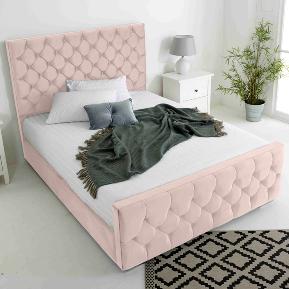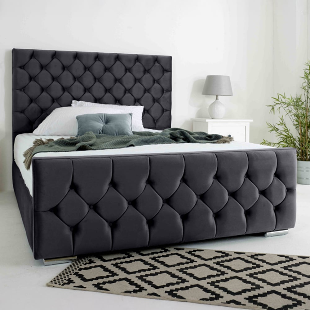 Introducing the Maya Plush Velvet Fabric Bed Frame, a hallmark of elegance and luxury, proudly made in Britain. Available in plush velvet fabric, this bed frame enhances any bedroom with its refined style. Featuring a classic Chesterfield headboard design, the Maya Bed Frame exudes timeless sophistication and offers a touch of grandeur to your space. This frame is designed to perfectly fit any room. Elevate your bedroom with the Maya Plush Velvet Fabric Bed Frame, where superior craftsmanship meets classic charm. Order now and experience unparalleled comfort and style.
