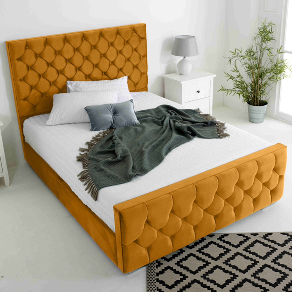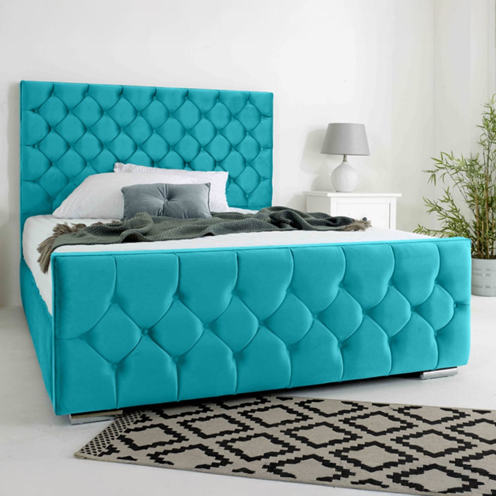 Introducing the Maya Plush Velvet Fabric Bed Frame, a hallmark of elegance and luxury, proudly made in Britain. Available in plush velvet fabric, this bed frame enhances any bedroom with its refined style. Featuring a classic Chesterfield headboard design, the Maya Bed Frame exudes timeless sophistication and offers a touch of grandeur to your space. This frame is designed to perfectly fit any room. Elevate your bedroom with the Maya Plush Velvet Fabric Bed Frame, where superior craftsmanship meets classic charm. Order now and experience unparalleled comfort and style.