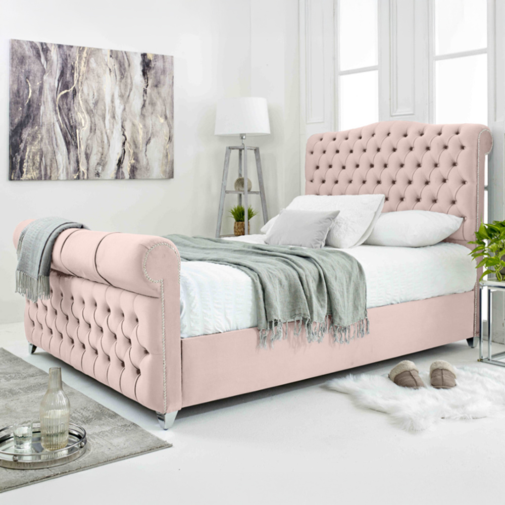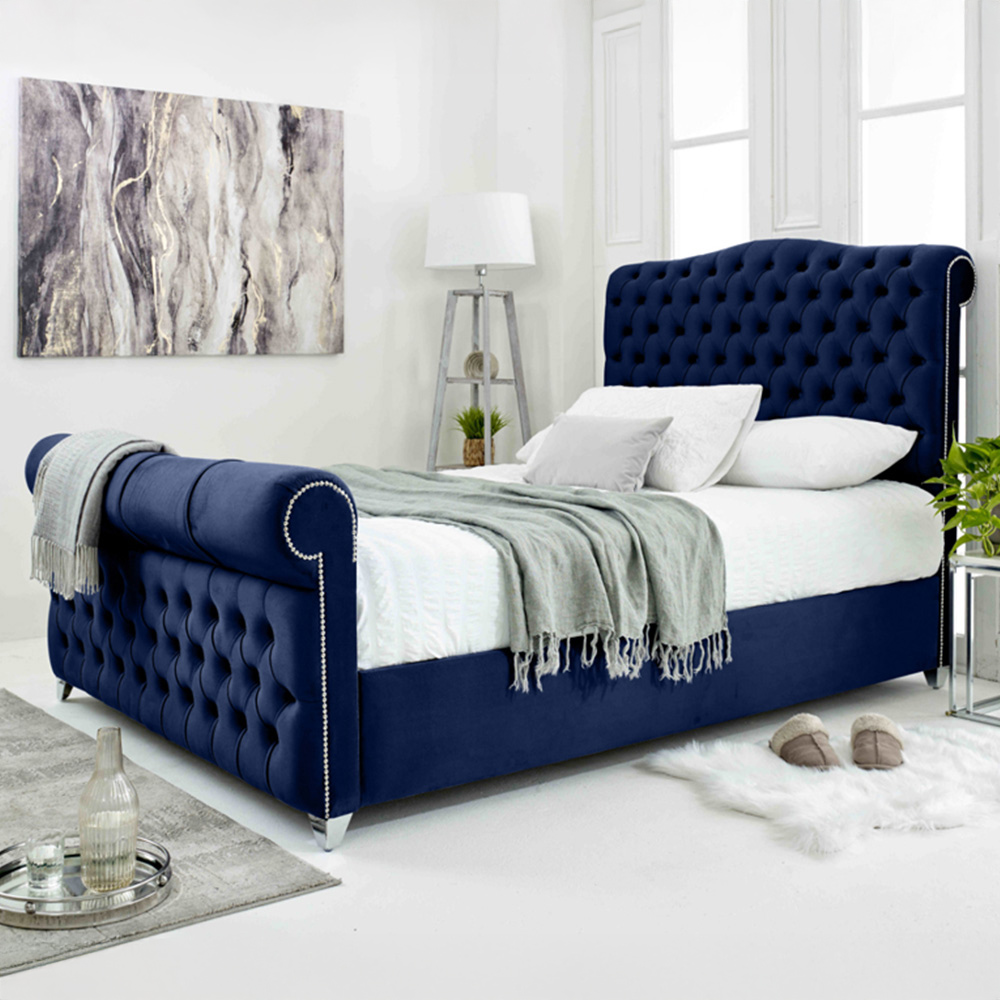 Introducing the Maynard Plush Velvet Fabric Bed Frame, a beautiful blend of classic elegance and modern luxury meticulously crafted in Britain. Available in a variety of rich colours in sumptuous plush velvet, this bed frame adds a touch of sophistication to any bedroom. The graceful curved scroll headboard design offers a timeless, refined look that enhances the aesthetic of your space. Transform your bedroom with the Maynard Plush Velvet Fabric Bed Frame, where superior quality meets elegant design.