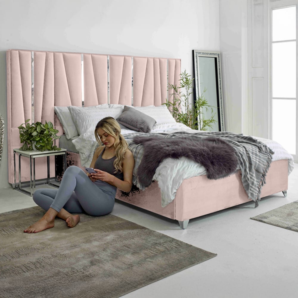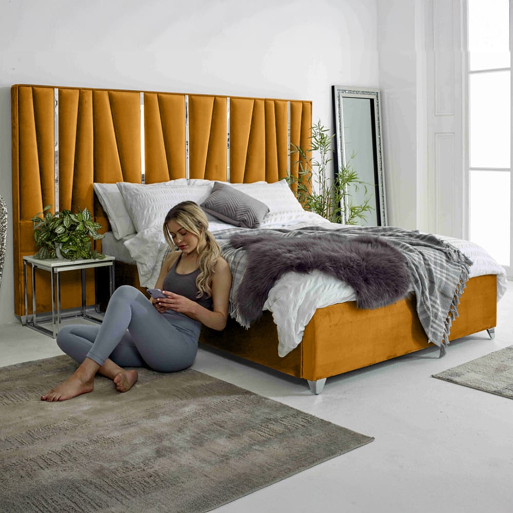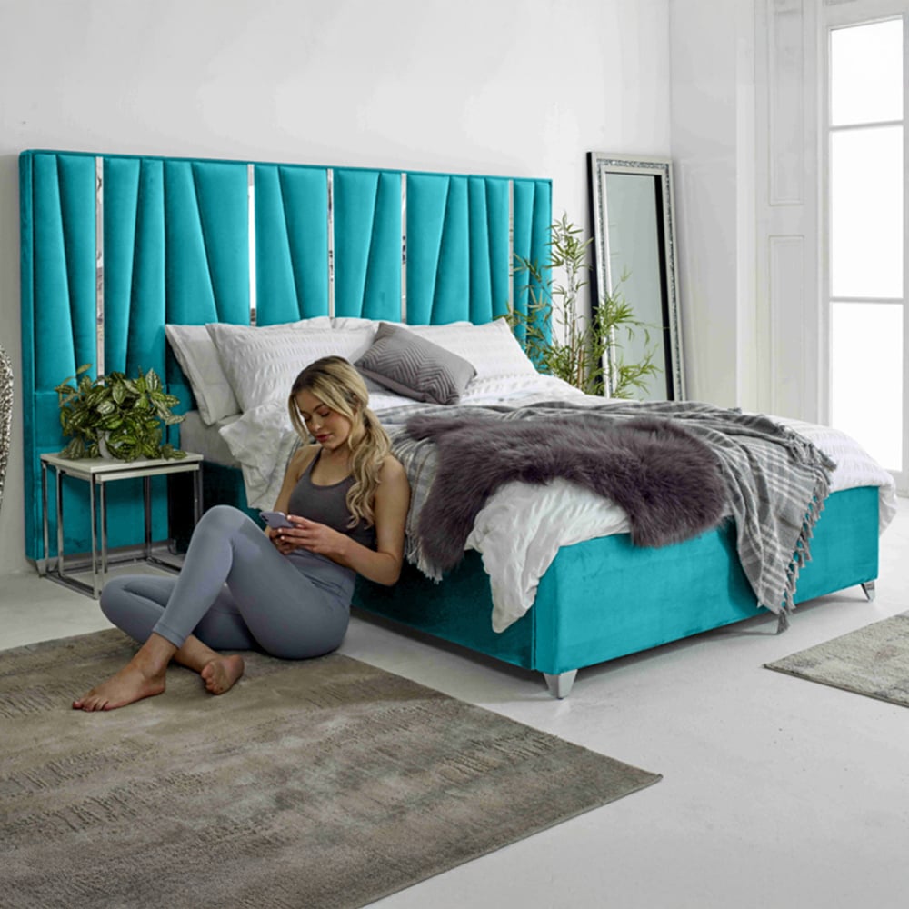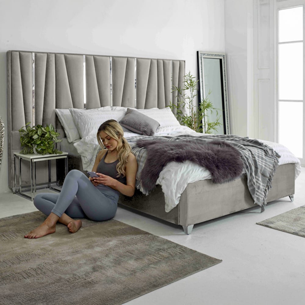 Introducing the Mila Plush Velvet Fabric Bed Frame, where luxury and modern elegance meet, meticulously crafted in Britain. Available in plush velvet fabric, this bed frame adds a touch of sophistication to any bedroom. The lined headboard design, beautifully enhanced with sleek silver strips, creates a stunning focal point that elevates your room’s decor. This Mila Bed Frame offers the perfect fit for any space. Transform your bedroom with the Mila Plush Velvet Fabric Bed Frame, combining exquisite quality with timeless style. Order now and indulge in the ultimate blend of comfort and elegance.