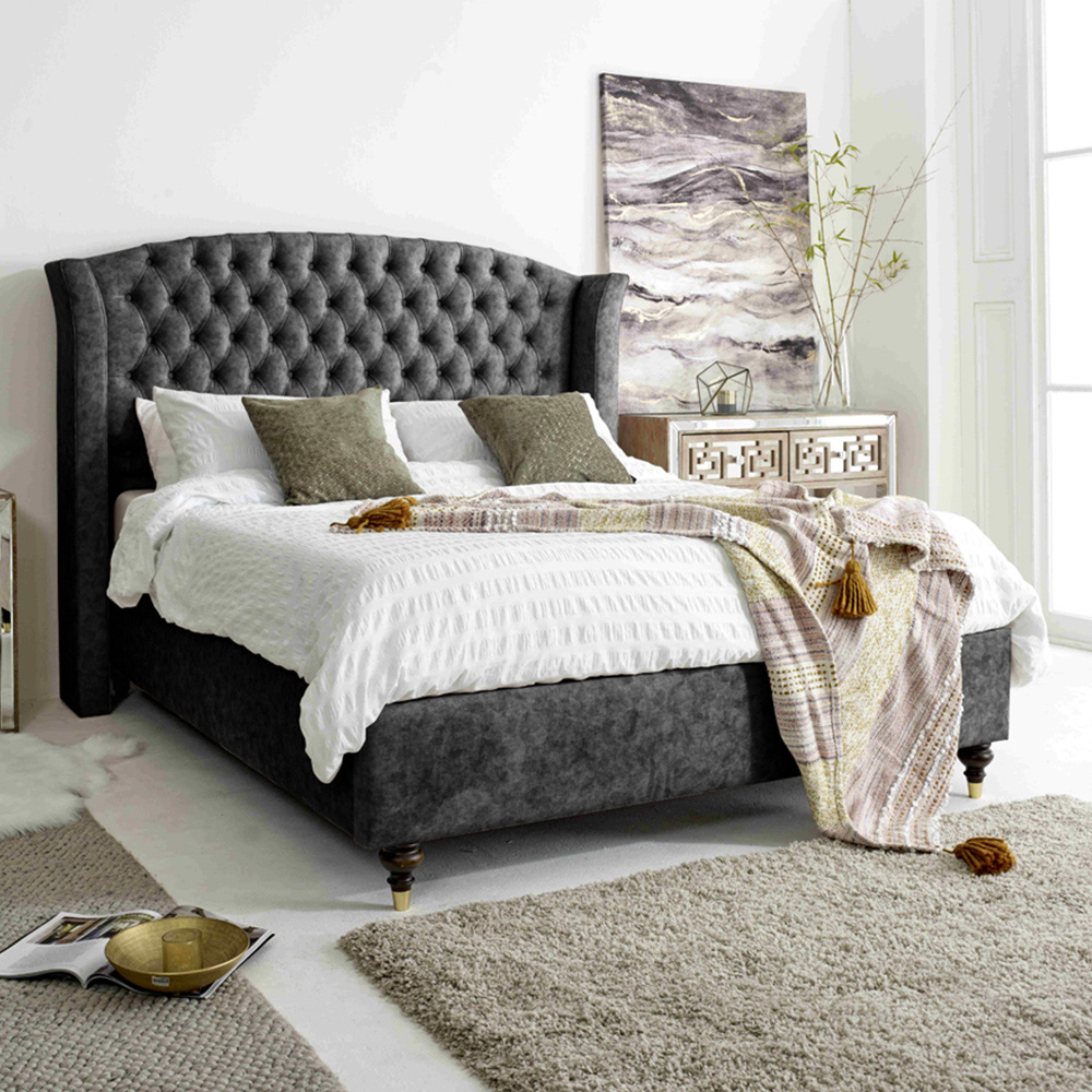- Features a stylish winged design Chesterfield headboard and matching buttons