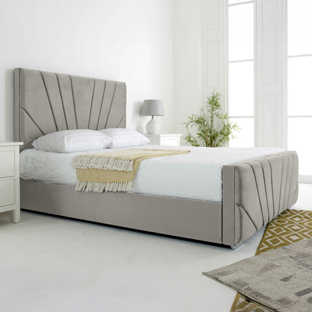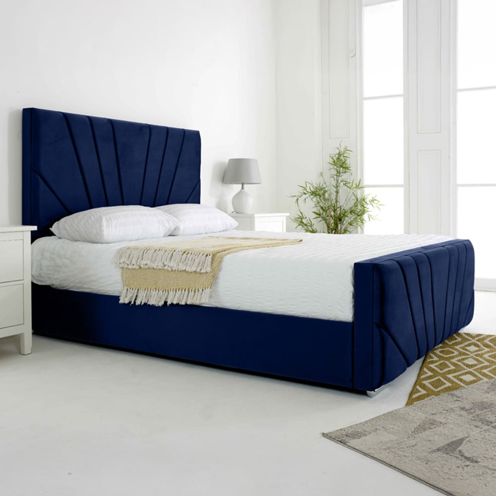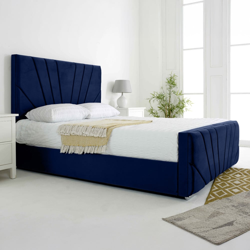 Introducing the Eleganza Scarlett King Size Blue Plush Velvet Bed Frame, where British craftsmanship meets luxurious design. Made from plush velvet fabric, this bed frame adds a touch of elegance and comfort to any bedroom. Featuring a striking sunrise headboard and footboard design, the Scarlett Bed Frame creates a bold focal point with its unique, contemporary curves.