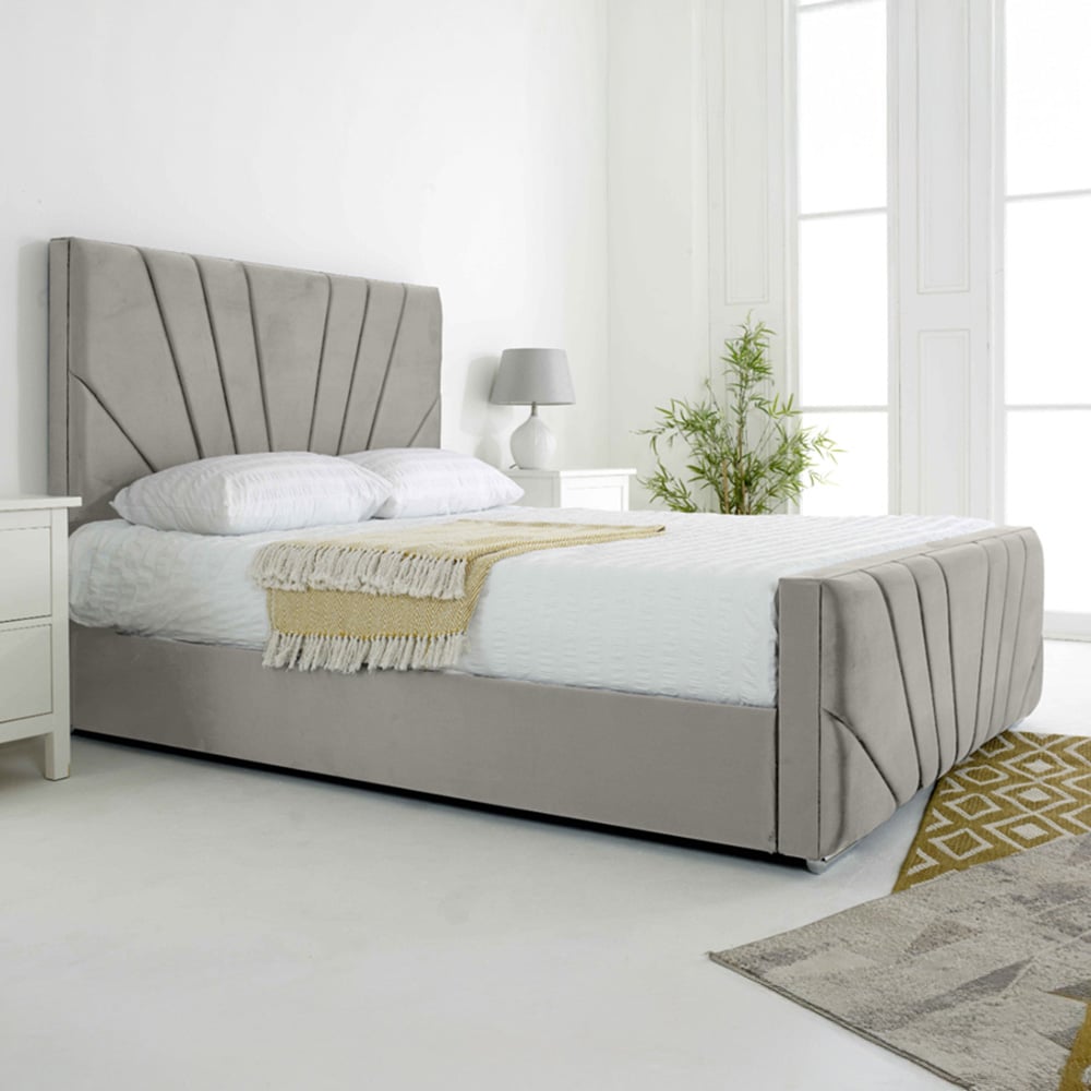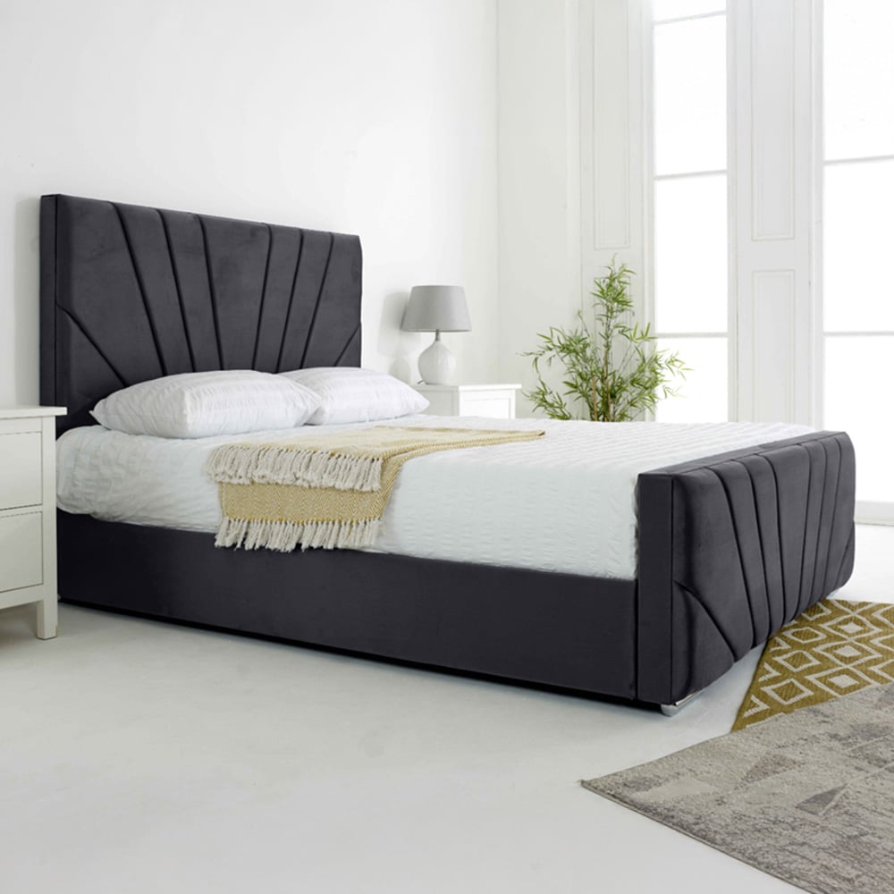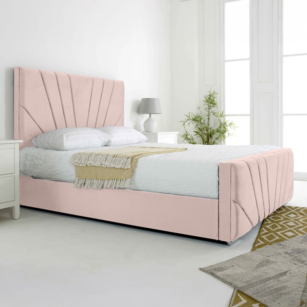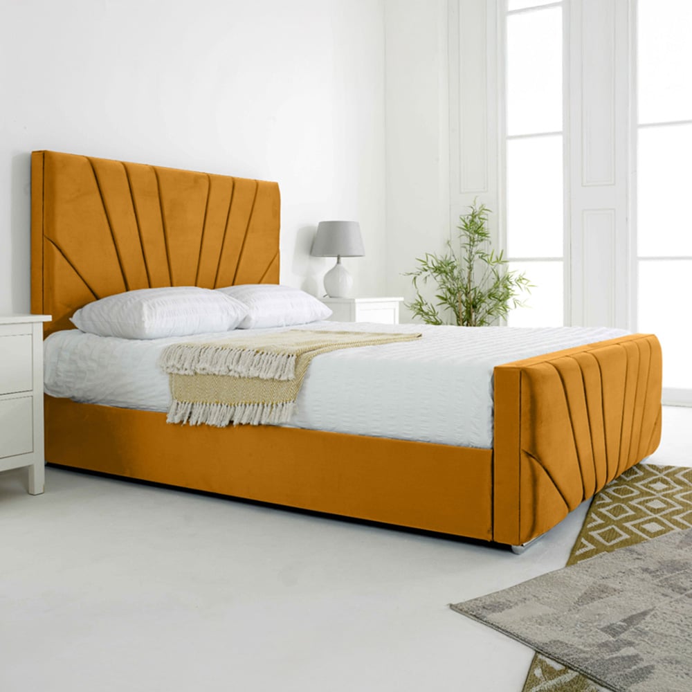 Introducing the Eleganza Scarlett Super King Blue Plush Velvet Bed Frame, where British craftsmanship meets luxurious design. Made from plush velvet fabric, this bed frame adds a touch of elegance and comfort to any bedroom. Featuring a striking sunrise headboard and footboard design, the Scarlett Bed Frame creates a bold focal point with its unique, contemporary curves.