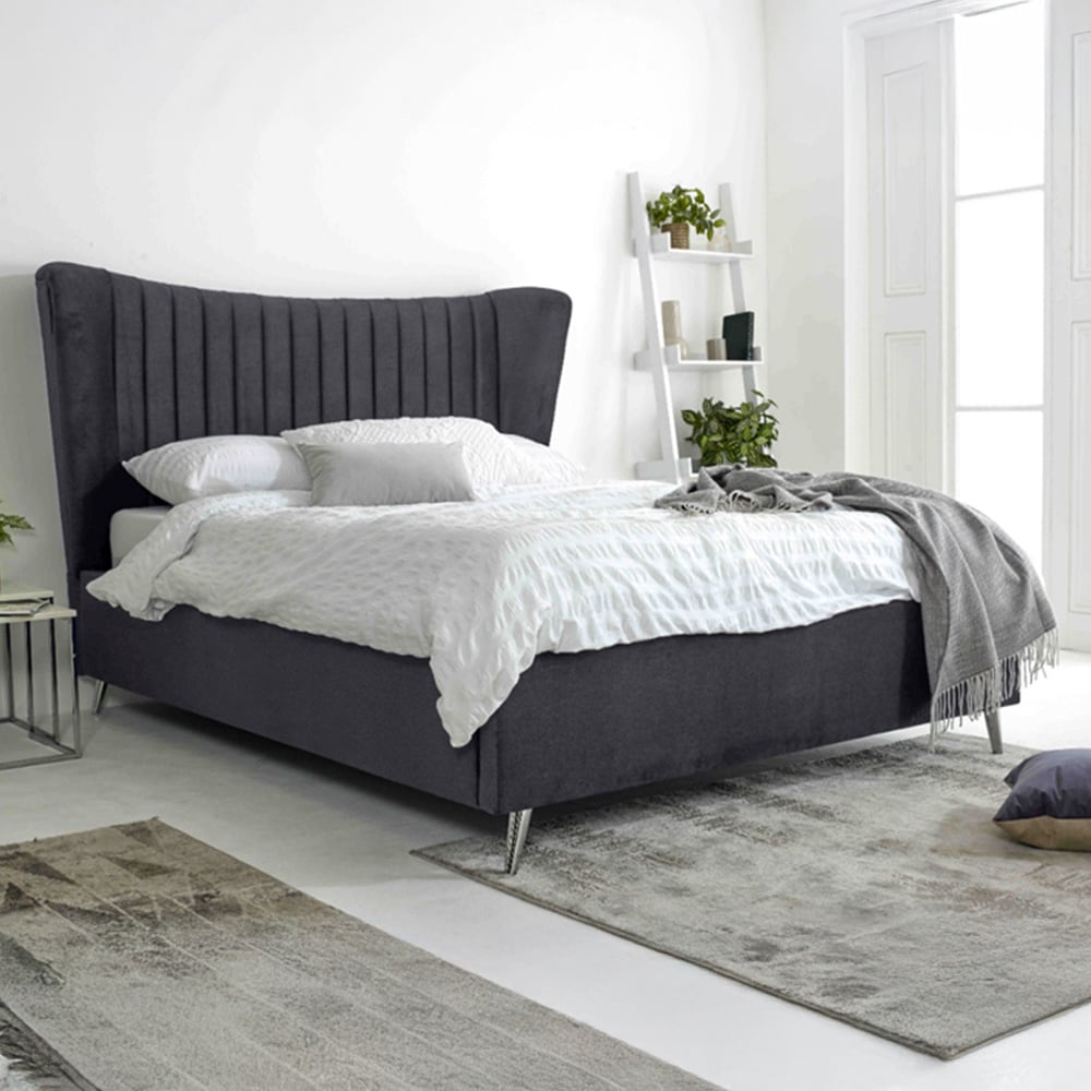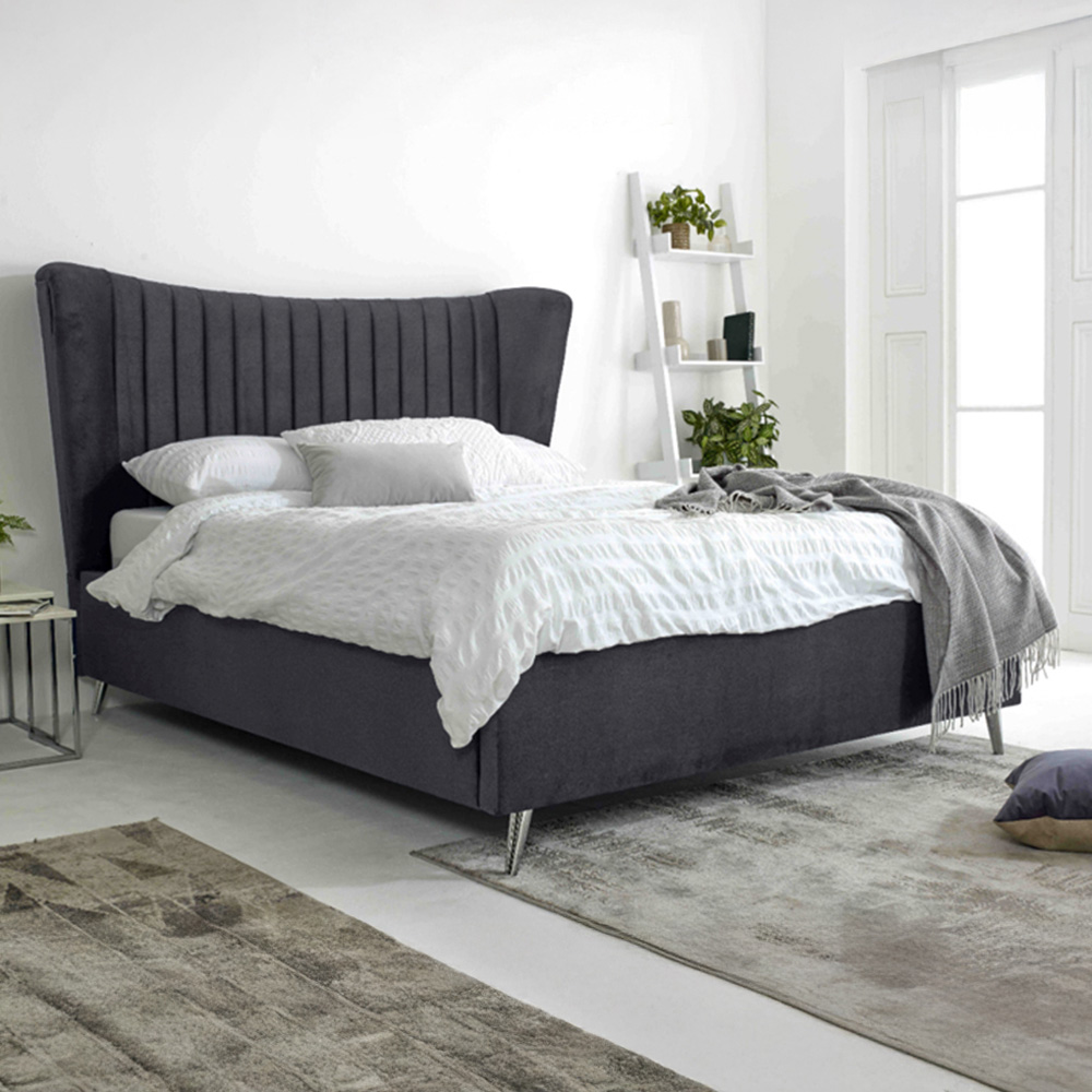 Introducing the Eleganza Tatum Double Steel Plush Velvet Bed Frame, a masterpiece of British craftsmanship that combines luxury and style. The lined winged headboard design enhances your space with its sophisticated, contemporary flair, creating a stunning focal point in your room.