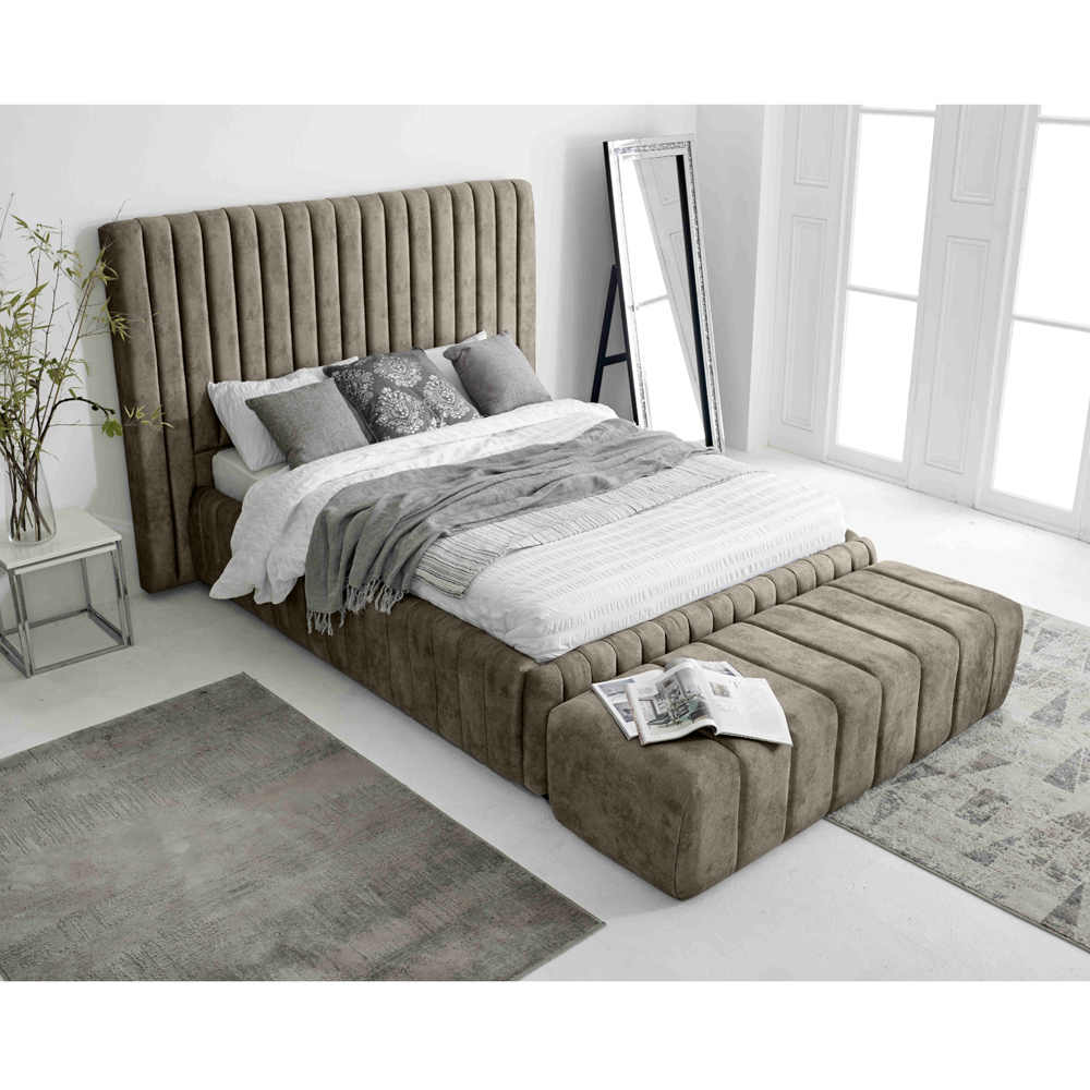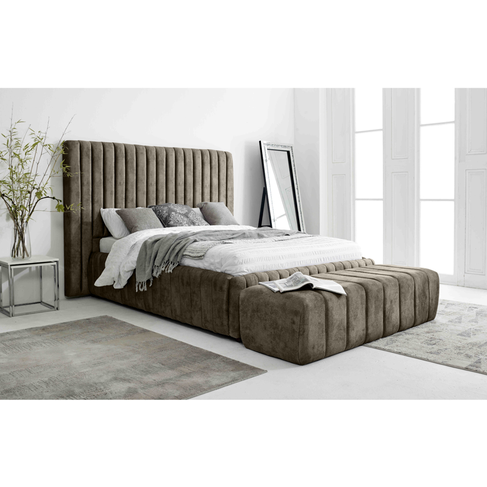 Introducing Eleganza The Elite Double Taupe Oakland Fabric Bed Frame, a stunning blend of luxury and modern design, meticulously crafted in Britain. This bed frame adds a touch of refined elegance to any bedroom. Featuring a lined wide headboard and footboard design, the bed frame offers a sleek and contemporary look that enhances your room with its stylish, presence.