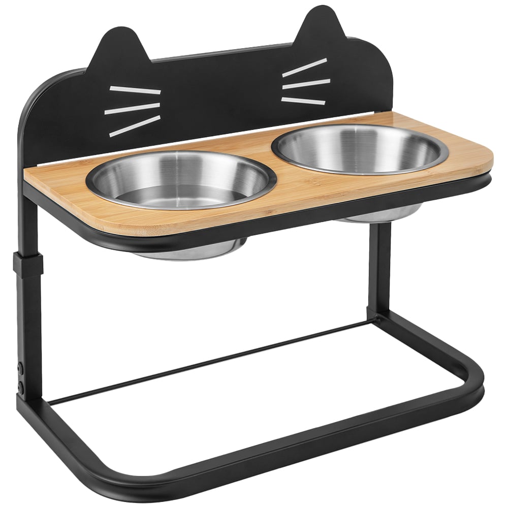 Elevate your pet's dining experience with the Costway Elevated Cat Feeder with Stainless Steel Bowls. It is designed to cater to your furry friend's comfort and health. This feeder's height can be adjusted to three different positions, making it perfect for cats and dogs of small to medium sizes. The elevated design not only offers a comfortable eating position but also helps reduce strain on your pet's back and neck, promoting a healthier posture during meals. Included with this feeder are two rustproof, dishwasher-safe stainless steel bowls that can hold up to 1400 ml each, ideal for satisfying your pet's hunger. Crafted from natural bamboo, the feeder is both waterproof and odour-free, supported by a stable metal rack for durability. It also comes with a white marker pen and a cute name tag, adding a personal touch while helping you keep track of feeding schedules.