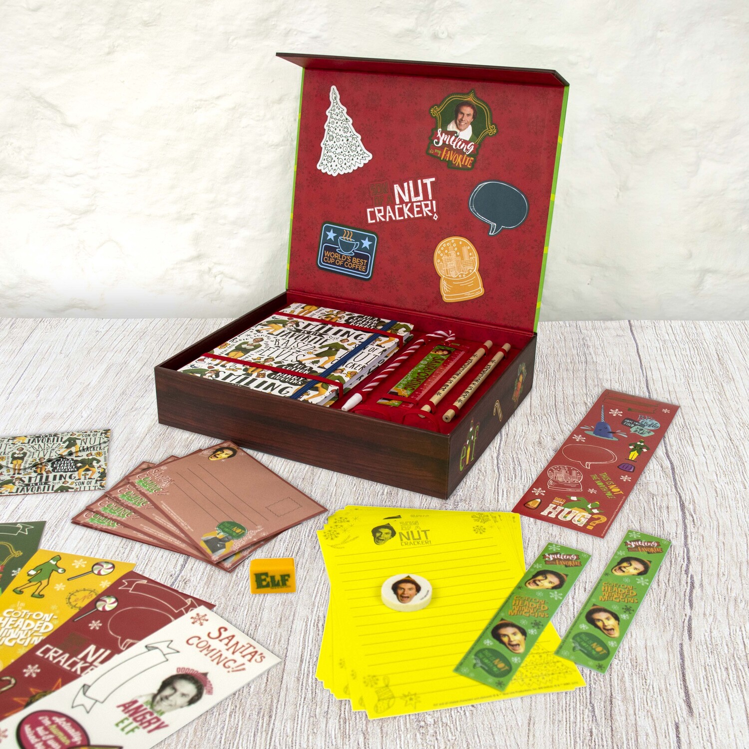 This wonderful Elf Keepsake Box is a must-have for all fans of the movies. Set includes an A5 casebound notebook, candy cane pen, sticker sheets, pencils, 12 letter writing sheets, six envelopes, an eraser, sharpener and more all in a storage box featuring fun elf artwork.
