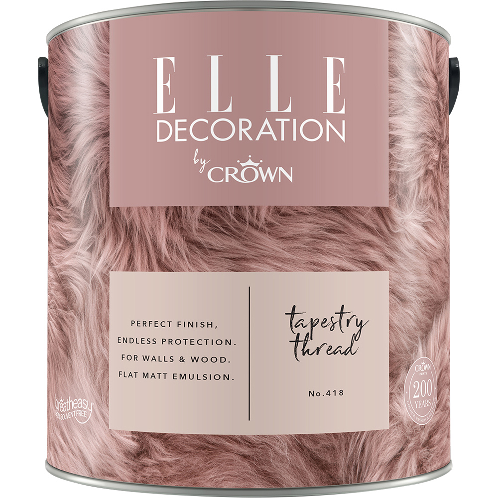 Revamp your living space with Elle Decoration Tapestry Thread 418 Flat Matt Emulsion Paint 2.5L. This high-quality, long-lasting flat matt emulsion paint is designed for interior walls and wood and features Crown’s unique breath-easy formulation. This impressive range combines undeniable style with exceptional durability. Available in a delicate hint of shell shade (Tapestry Thread No. 418), this resilient paint is 200 times tougher and more washable than standard options, making it easy to wipe away marks and stains.