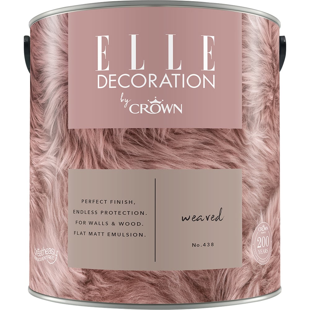 Revamp your living space with Elle Decoration Weaved 438 Flat Matt Emulsion Paint 2.5L. This high-quality, long-lasting flat matt emulsion paint is designed for interior walls and wood and features Crown’s unique breath-easy formulation. This impressive range combines undeniable style with exceptional durability. Available in a chalky soft truffle shade (Weaved No. 438), this resilient paint is 200 times tougher and more washable than standard options, making it easy to wipe away marks and stains.