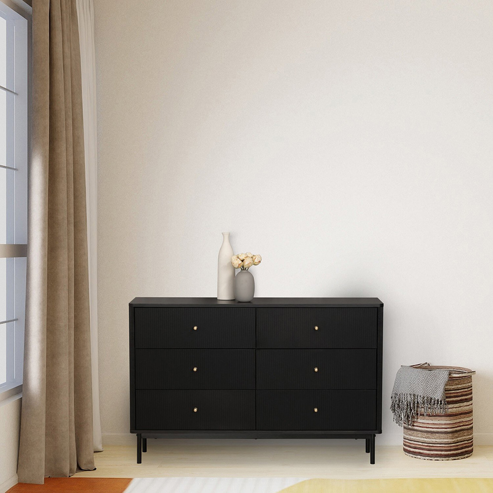 Bring some modern style to your bedroom with the Emilia 6-Drawer Chest. The six spacious drawers allow you ample opportunity to organise and store your clothing, keeping your bedroom neat and organised for better harmony in your home. The lightweight MDF will prove sturdy, while the entire unit will be easy to assemble. It has a stunning tone which compliments your home decor and sleek, rounded gold handles for the perfect finishing touch. It's a contemporary must-have for your bedroom.