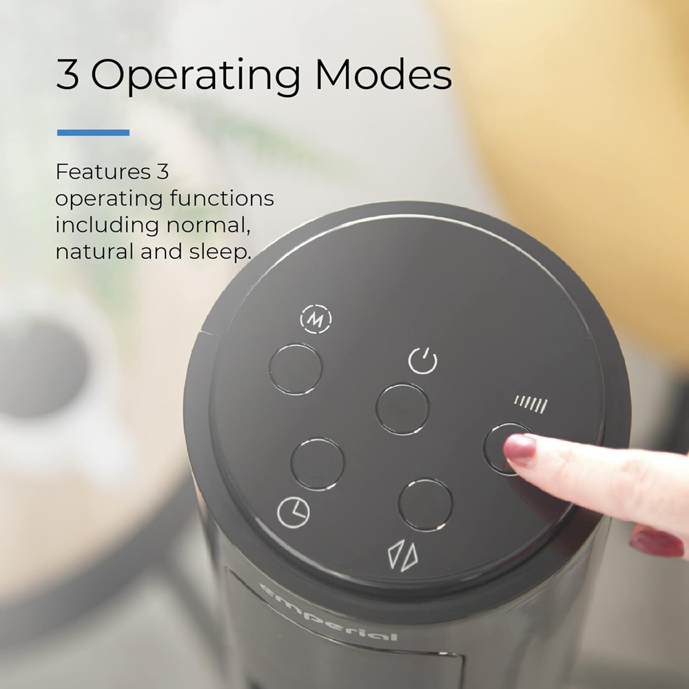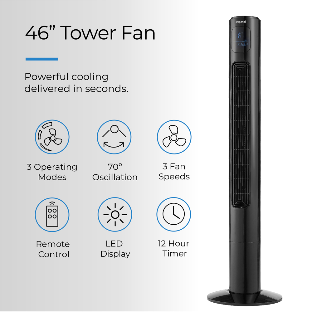 Feel the cool breeze with the powerful 46" Tower Fan from Emperial. Featuring 3 fan speeds and a wide 70° Automatic Oscillation to deliver cool air across your room. The 3 versatile operating modes will allow you to create your perfect cooling environment with the natural, sleep, and fan mode. The built-in timer can be set for length of operation up to 12 hours before shutting off automatically. Comes with an easy to use remote control and energy saving LED display in a modern black finish.