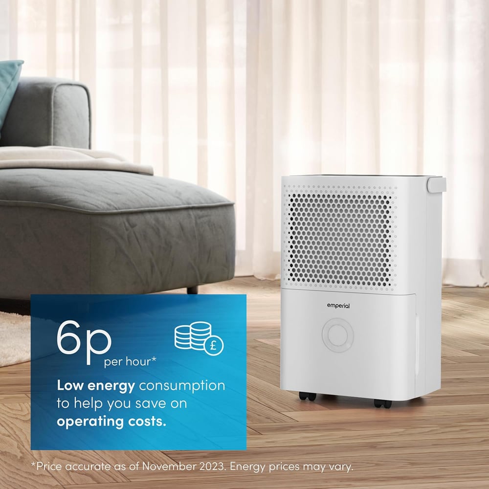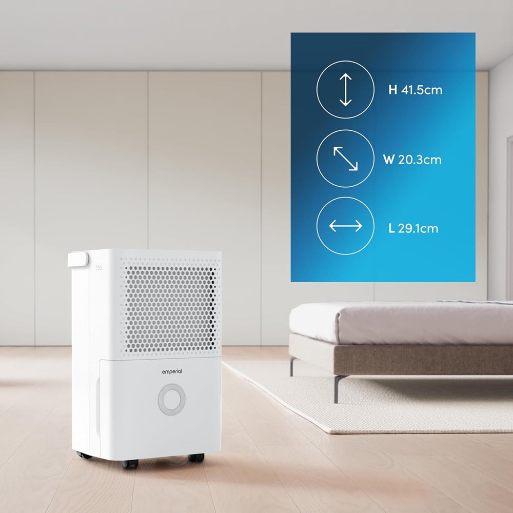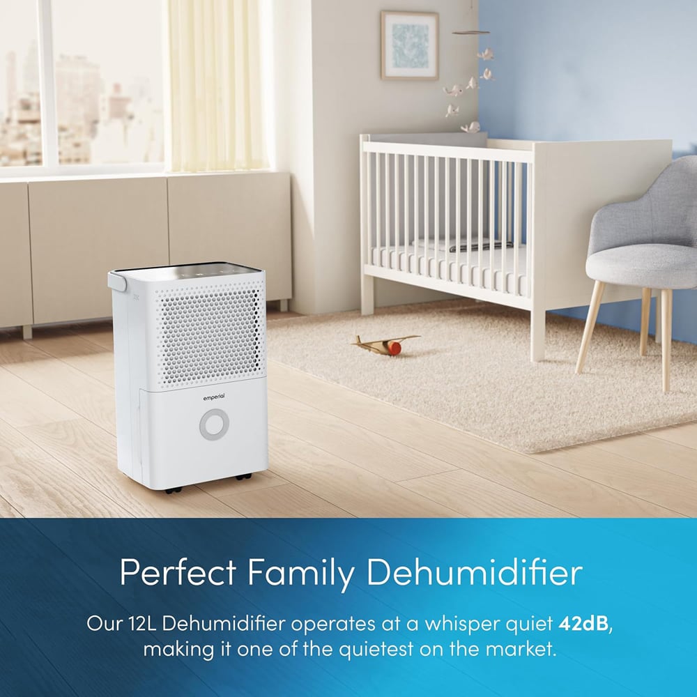 The Emperial 12L Dehumidifier is ideal for eliminating dampness, mould, and moisture, ensuring your living space stays fresh and clean. It utilises an energy-efficient compressor to extract 12L of moisture per day and is equipped with a large 1.8L water tank.