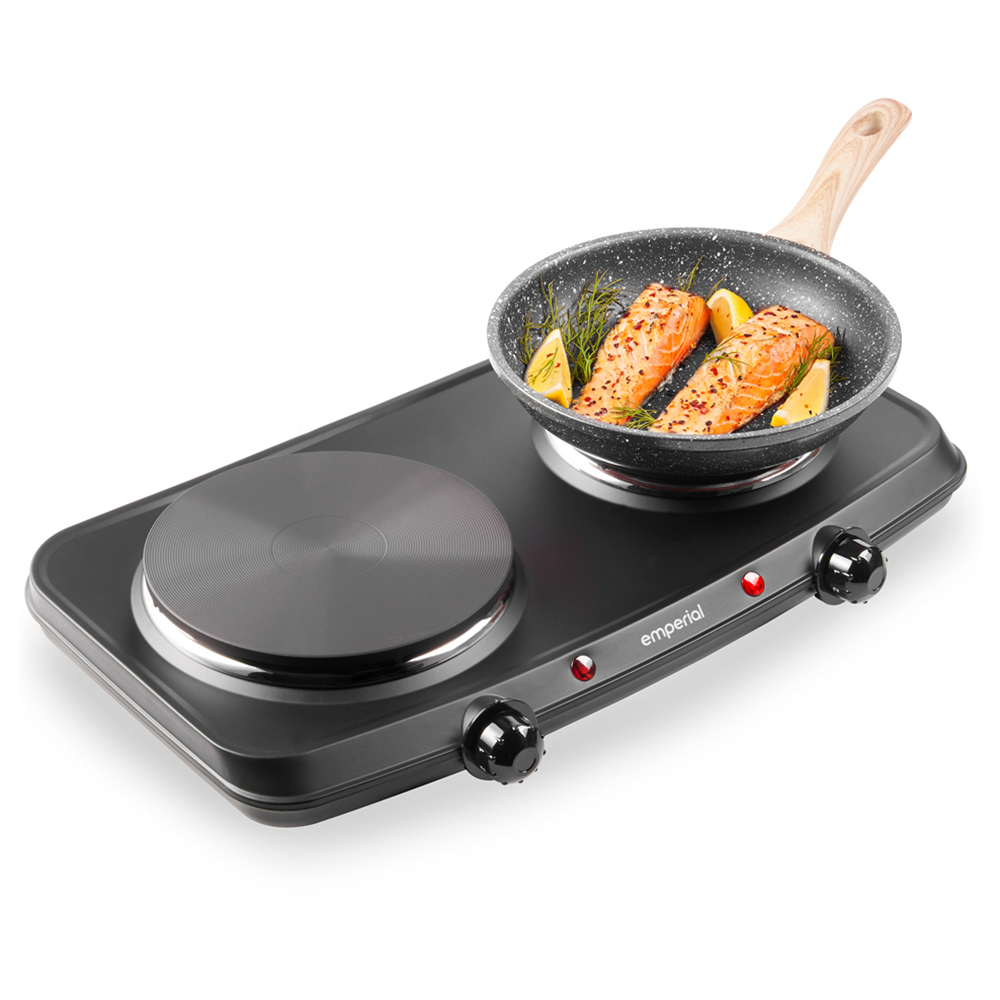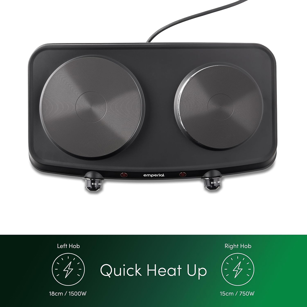 This double electric hot plate from Emperial is ideal for small kitchen spaces, student accommodation, caravans, holiday homes or even as an extra hob for large family dinners. Comes with 2 durable plates made from cast iron for quick and efficient heating. The plates are compatible with multiple cookware and each has independent variable temperature control dials with 5 heat settings. Features overheat protection and non-slip rubber feet for safe use and peace of mind.