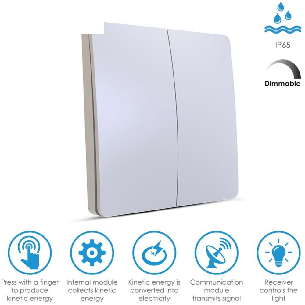 Experience the convenience of the ENER-J 2 Gang Wireless Kinetic Switch in White Finish along with 2x 500W RF Non-Dimmable Receiver Modules. With no batteries or wiring required, this eco-friendly switch can be installed anywhere. The wireless remote control allows for easy operation, and the effective range reaches up to 30 metres indoors and approximately 100 metres outdoors. The 500W RF Receiver Modules fit easily into the lighting circuit and can be paired in simple steps with the wireless kinetic switch. The Wireless Kinetic Switch needs no wiring, no batteries and no drilling of any holes in the wall, and is also IP56 rated, which means it can be installed anywhere, whether indoors or outdoors.