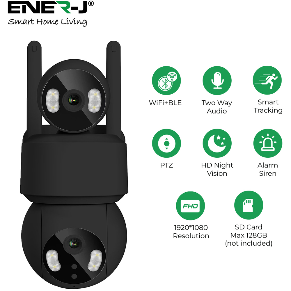 Protect your property with the Ener-J Black Dual Lens Smart WiFi Outdoor IP Dome Camera. This modern camera is designed to withstand the elements with its IP65 rating, ensuring durability. It comes equipped with advanced features including auto-tracking, human detection, and an impressive 30m colour night vision capability, delivering comprehensive outdoor security. The two-way audio functionality allows for seamless communication, and it seamlessly integrates with Alexa Echo Show and Google Home Assistant. The PTZ camera boasts a 320-degree field of view, with an additional 120-degree manual adjustment, and dual screens for effortless monitoring. With this camera, you can capture crystal-clear 4MP HD images and videos day and night, surpassing the performance of standard 2MP cameras. The human detection feature enables the camera to automatically track movements and trigger real-time alarms, sending notifications through the TUYA app.