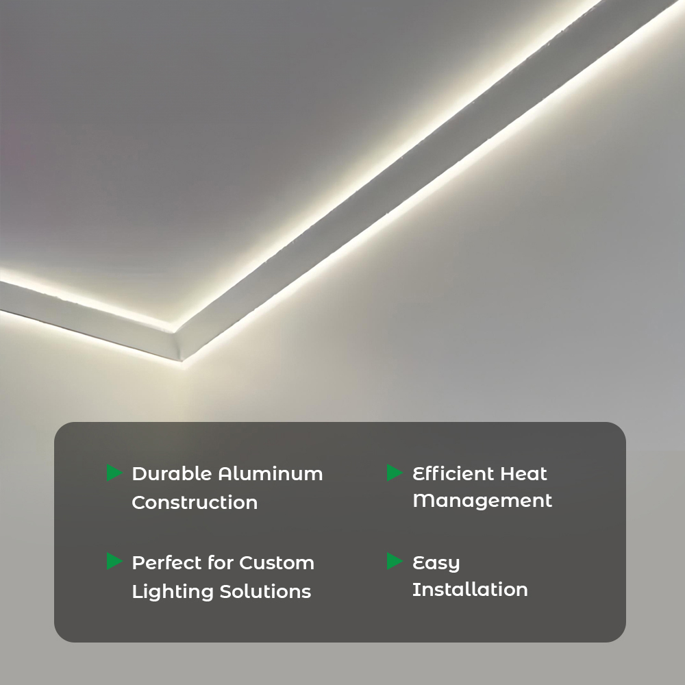 The Gypsum LED Cove Light 45 Degree Corner Aluminium Profile offers a versatile, sleek, and efficient solution for integrating LED lighting into your home or office. Available in elegant white finish, this 2-meter profile accommodates LED strips for creating ambient lighting along walls, skirting boards, or under cabinets. Crafted from high-quality aluminium with a polycarbonate cover and end caps, it provides exceptional durability, heat dissipation, and long-lasting performance.