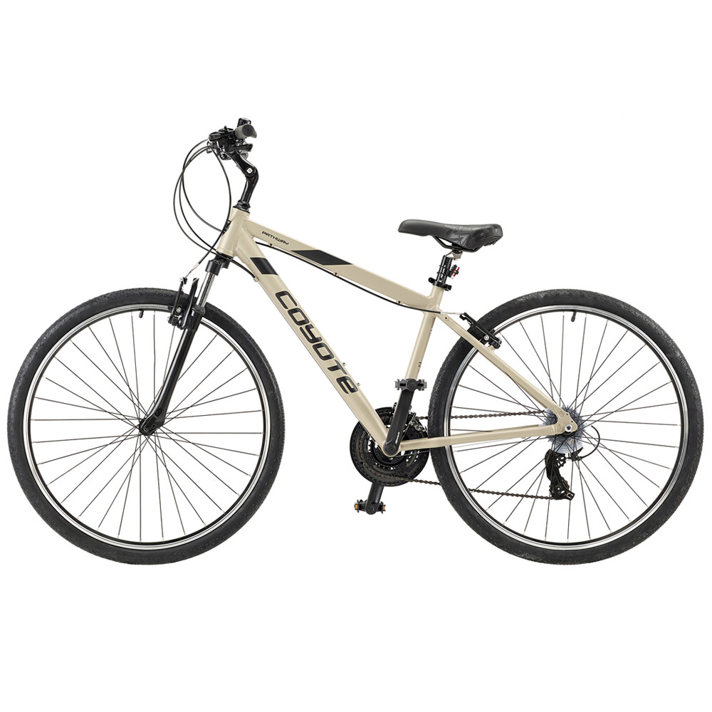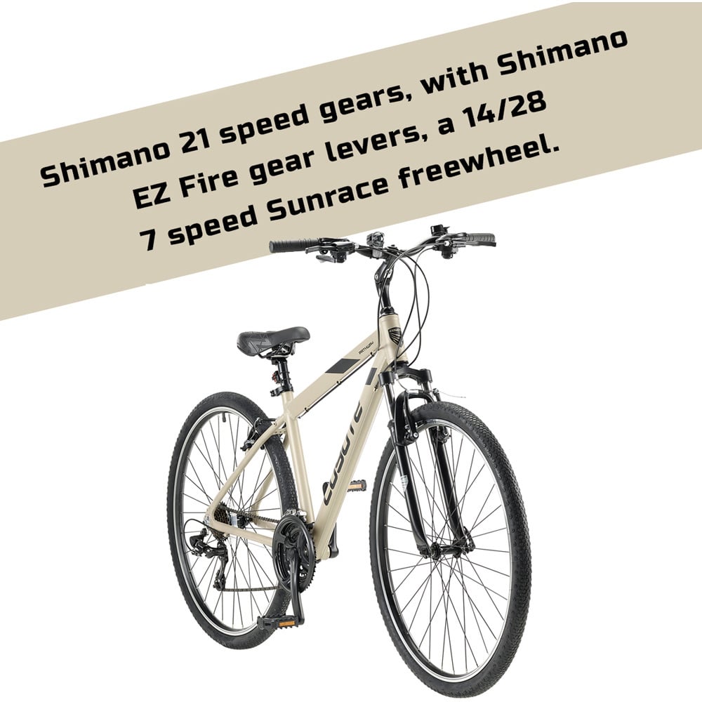 Experience adventure like never before with the Ener-j Coyote Pathway FS Gents 21 Speed 17.5 inch Bike. From the gents urban saddle to the micro-adjust alloy black 350mm seat post, QR seat clamp, and front and rear lights, this bike has got you covered. Built with durable 700C alloy, the urban-style frame is designed to withstand the rigours of city life while maintaining a sleek aesthetic. The zoom suspension fork featuring a V brake pivot ensures a smooth and controlled ride over uneven surfaces and potholes, making it the perfect choice for urban terrain. Navigating the city streets has never been easier with the Shimano 21-speed gears and EZ Fire gear levers, paired with a 14/28 7-speed Sunrace freewheel for seamless gear changes. Don't let the city limit your cycling experience - choose this bike and enjoy the effortless shifting performance and a comfortable ride every time.