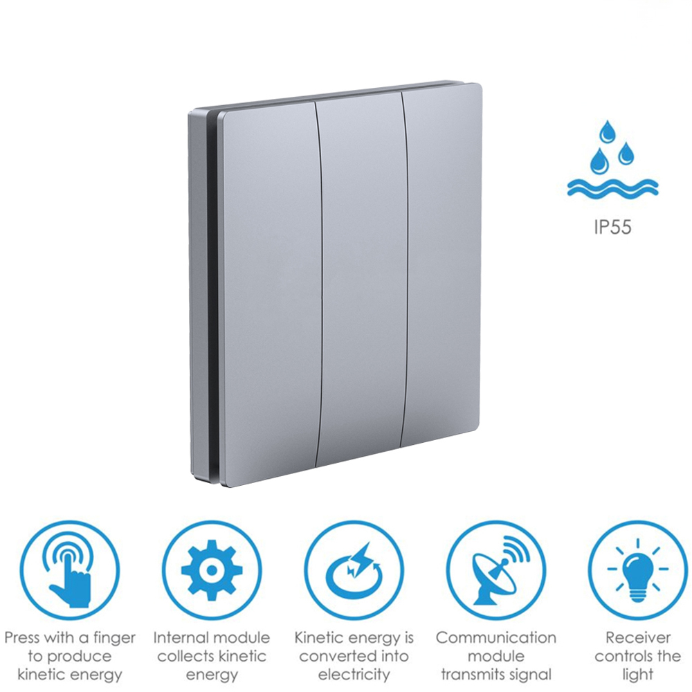 Experience the future of smart switches with this innovative Eco Series, 3 Gang Wireless Kinetic Switch in Silver Body. Powered by kinetic energy technology, this switch requires no batteries, wiring, or drilling holes, making it eco-friendly and easy to install anywhere without additional costs or labour. The encrypted wireless signal ensures secure communication, allowing the switch to work flawlessly up to 20 meters indoors and up to 80 meters outdoors. Designed to fit seamlessly into any decor, the switch is compatible with various light types and can be used in limited spaces. Enjoy the convenience of controlling multiple lights or multiple switches controlling one light with flexible coding options.
