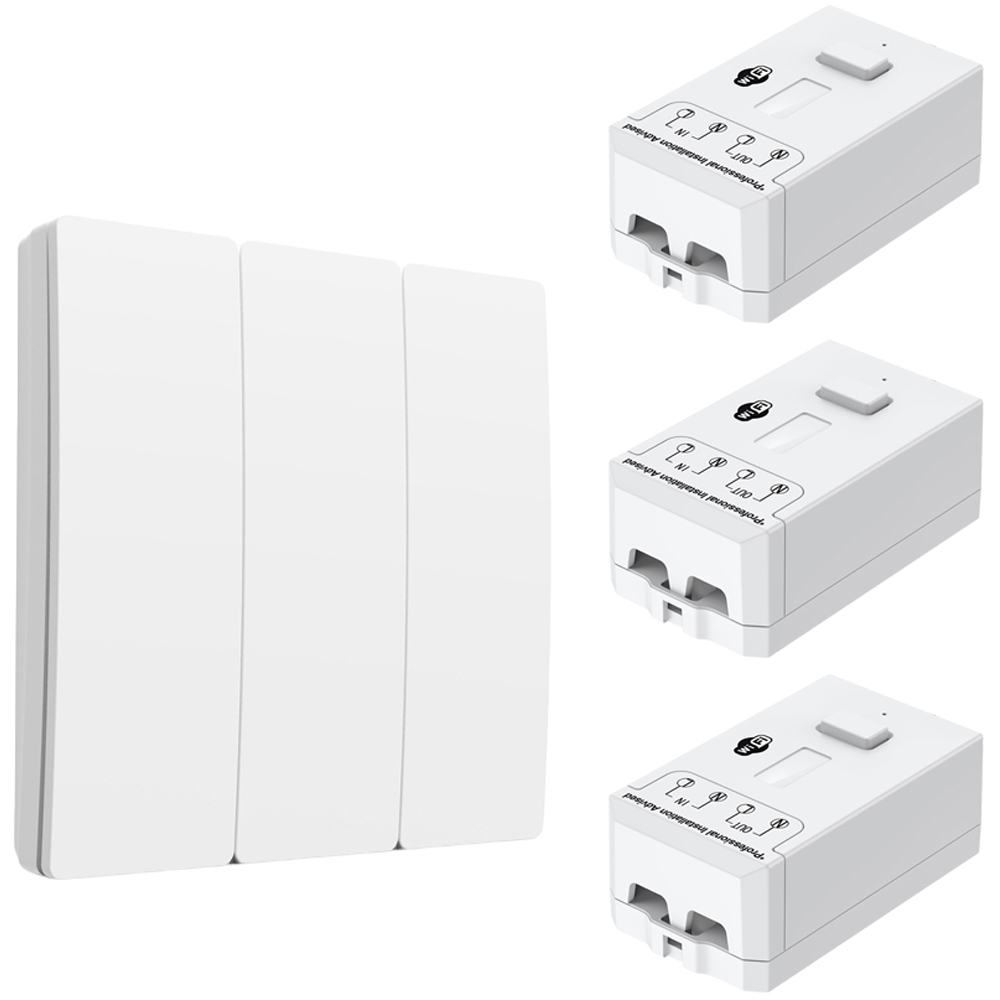 Experience the convenience of wireless technology with the ENER-J 3 Gang Wireless Kinetic Switch and 3 units of 500W RF+WiFi Non-Dimmable Receiver. No more wiring, no batteries, and no drilling holes in the wall. The kinetic switch generates its power, providing a seamless and eco-friendly solution. The Non-Dimmable receiver can be paired with the Wireless Switch via RF for easy control or connect the receiver to your Wi-Fi by downloading the ENERJSMART App to control it from anywhere or use voice commands with Alexa, Google Home, Siri, or Apple Watch. Set timers on the app to save electricity, and create scene settings to group multiple receivers.
