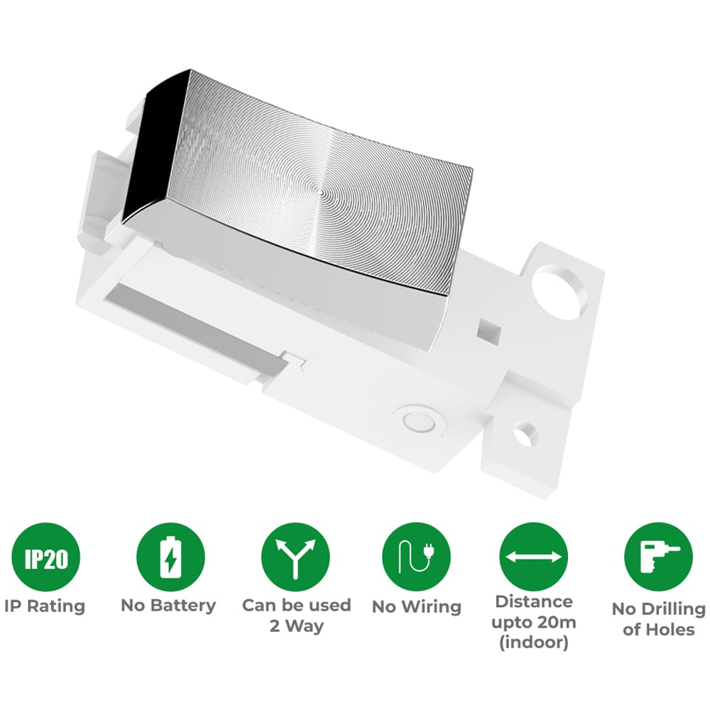 Upgrade your home with the ENER-J 1 Gang Grid Switch, featuring an elegant Satin Chrome finish. Compatible with Click MiniGrid Powergrid system, this wireless grid switch offers effortless installation and seamless integration into Click MiniGrid plates. Say goodbye to wiring hassles and batteries – our innovative kinetic system transforms movement into energy, providing reliable operation without the need for external power sources.