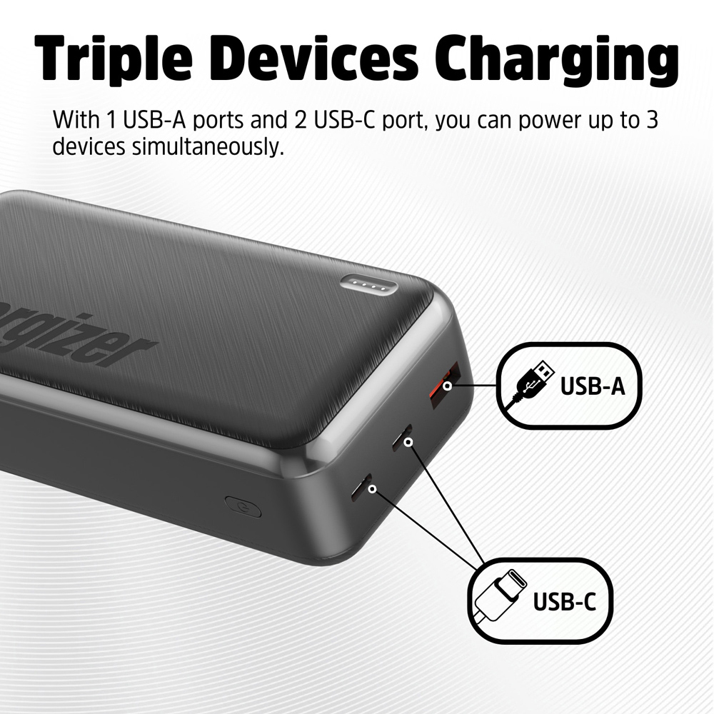 Energizer UE30055PQ delivers 30,000mAh ultra-high capacity to support your daily mobile life. With triple outputs, including 2 USB-C output ports and 1 USB-A output port, it allows simultaneous charging for up to 3 devices. The USB-C Power Delivery feature ensures a swift 20w charge for the latest iPhones and other USB-C devices, while the intelligent USB-A output ports provide efficient fast charging of up to 22.5w for Android devices. The Power Delivery fast recharge feature enables fast recharge to your battery bank. The LED battery life indicator offers a convenient way to check the charging status and remaining battery level at a glance. Energiser Power Safe Management guarantees protection against short circuits, overcurrent, overcharging, and over-discharging, ensuring the safety of both your power bank and devices.