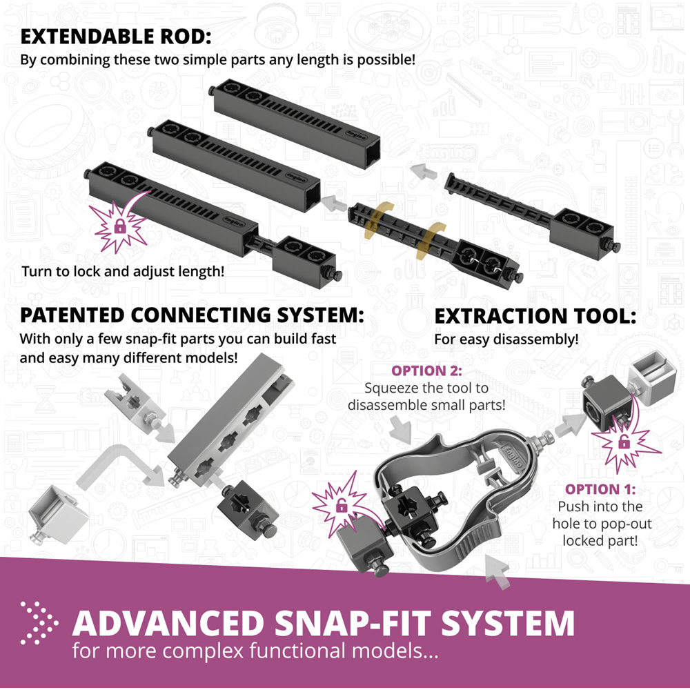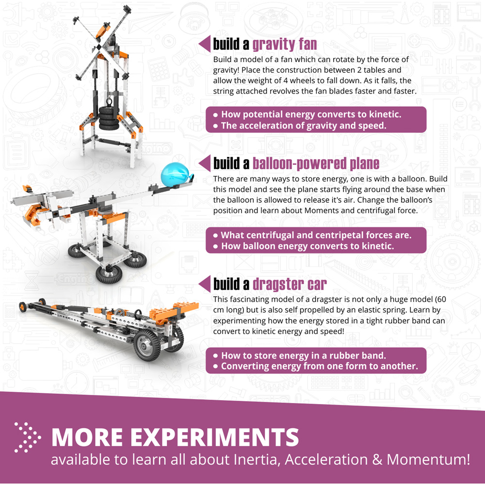 Learn all about Newton's laws of motion which are the basis of classical mechanics that still describe most everyday life situations with this Engino Stem Newton Laws Inertia Momentum Kinetic and Potential Energy Building Set. Experiment with kinetic and potential energy in order to discover the properties of energy and how it is transformed from one form to the other. Build 8 working models such as a ballistic catapult, a gravity fan, a collision car, a moving cabin, a balloon powered plane and a dragster. You can find easy-to-follow building instructions for all models either online or in the booklet included. The booklet provides detailed explanations of the different scientific principles applied and incorporates innovative experimental activities for hands-on learning. A Quiz section is also available to challenge your newly acquired knowledge. Suitable for ages 9 years and above.