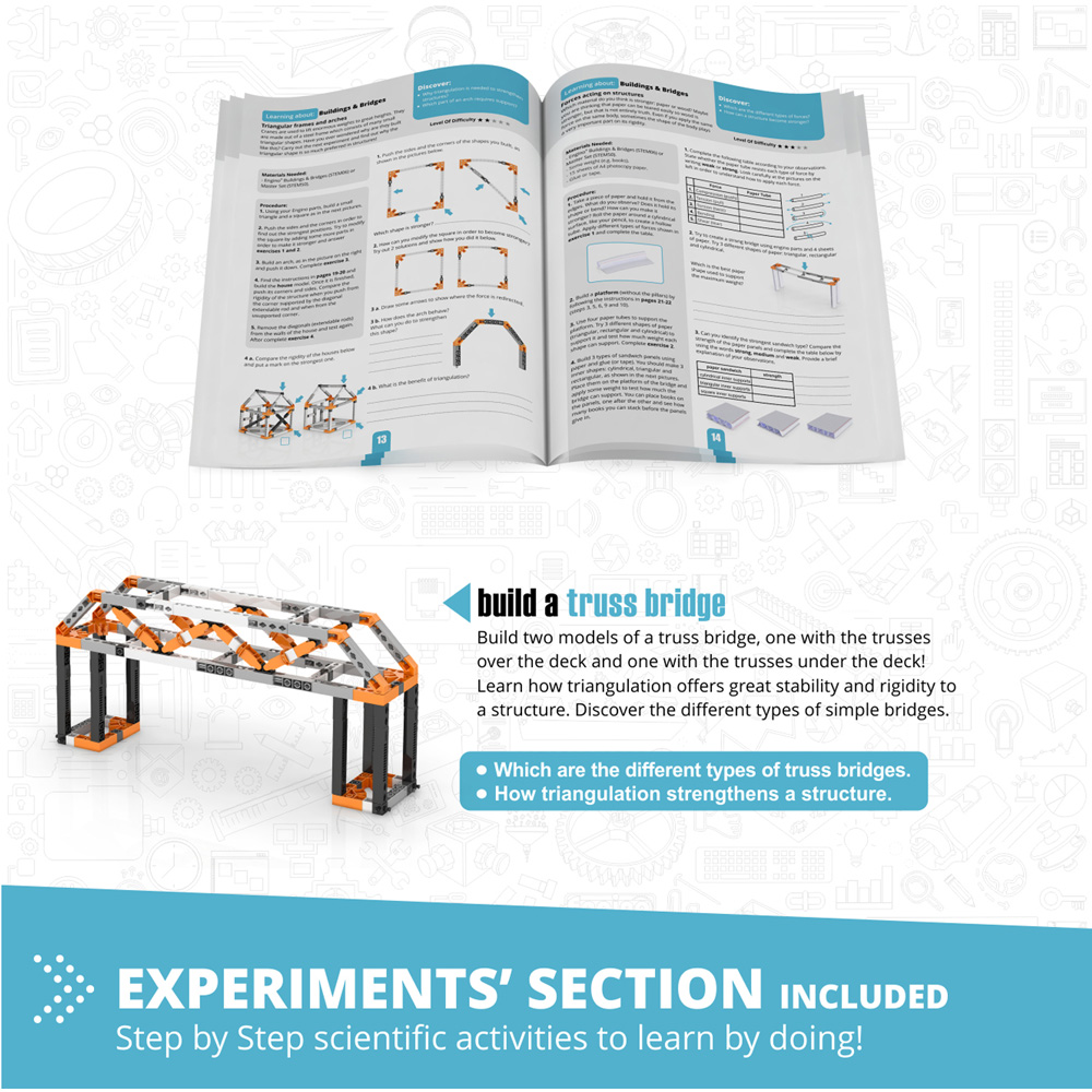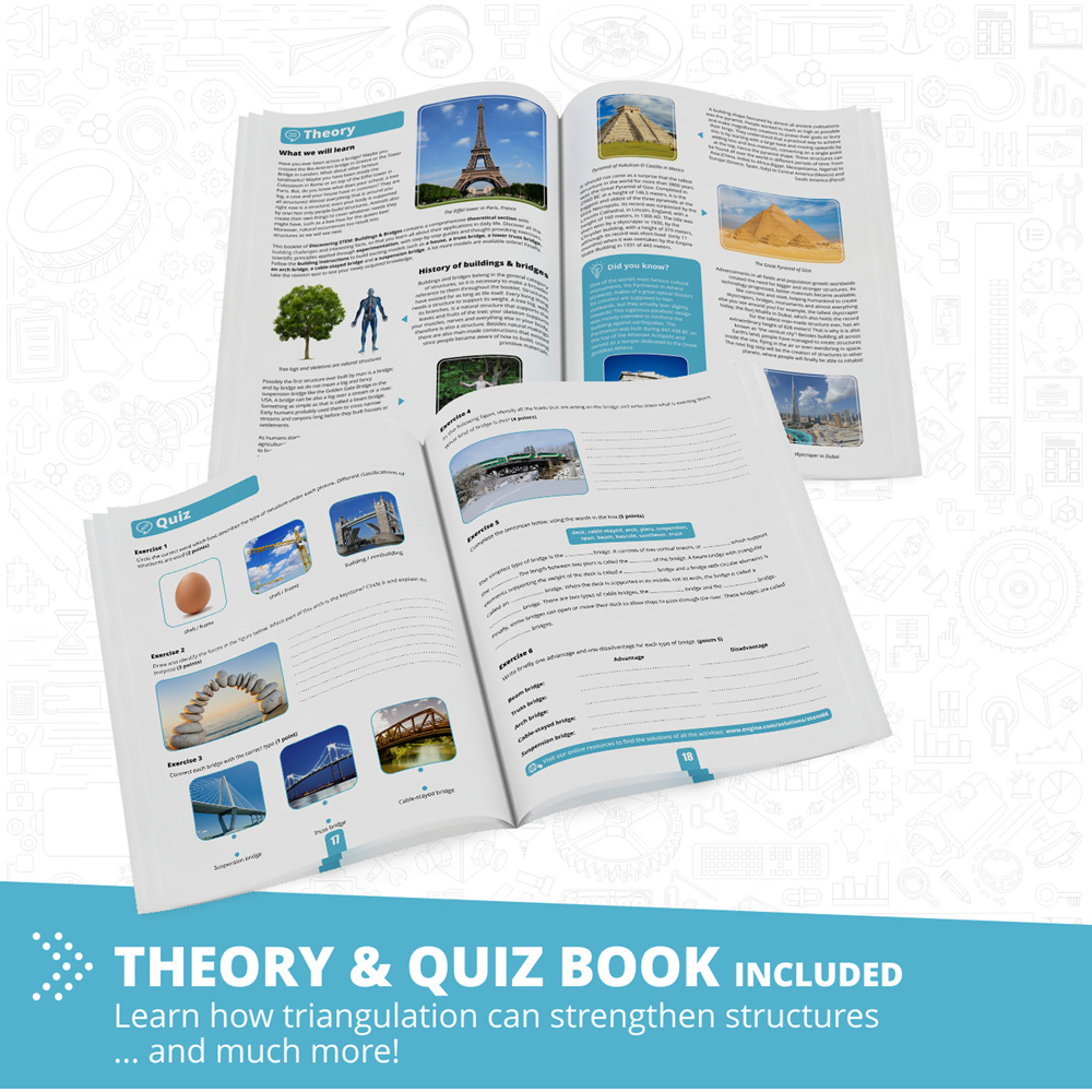 Learn all about buildings and how they literally support our lives with this Engino Stem Structures Buildings and Bridges Building Set! Experiment with different types of bridges and find out how their architecture design provides massive weight support. Discover all the types of forces applied and how engineers manage to reduce their effects. Build nine working models such as a house, a pyramid and various types of bridges: beam, arch, truss, cable-stayed and suspension bridge. You can find easy-to-follow building instructions for all models either online or in the booklet included. The booklet provides detailed explanations of the different scientific principles applied and incorporates innovative experimental activities for hands-on learning. A Quiz section is also available to challenge your newly acquired knowledge. Suitable for ages 9 years and above.