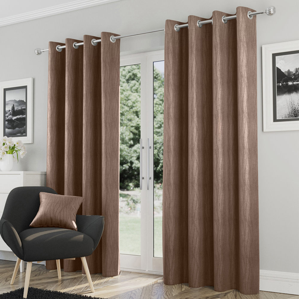 Elevate your place with this pack of 2 Enhanced Living Goodwood Bronze Embossed Wave Thermal Eyelet Curtain 117 x 183cm. Experience the benefits of an energy-efficient, noise-reducing, dimout-ready curtain with an eyelet header. Utilising the latest triple weave technology, this curtain effectively blocks out light and reduces outdoor noise. The thermal efficiency of this curtain can decrease energy loss by over 20%, keeping your room cool in the summer and warm in the winter. The eyelet header allows for easy hanging on standard poles. Made from 100% polyester, this curtain is easy to care for. It features a triple weave room-darkening embossed design with a horizontal wave pattern and an eyelet header. This curtain is easy to put up and slide open and closed. The blackout effect of this thermal curtain, achieved through triple weave technology, eliminates the need for lining or chemical coating, helping to improve sleep and well-being by stopping light from entering. Additionally, it reduces noise, contributing to a better night’s sleep. Wash care: Hand wash only, do not bleach or tumble dry, and cool iron on reverse. Note: The rod is not included.