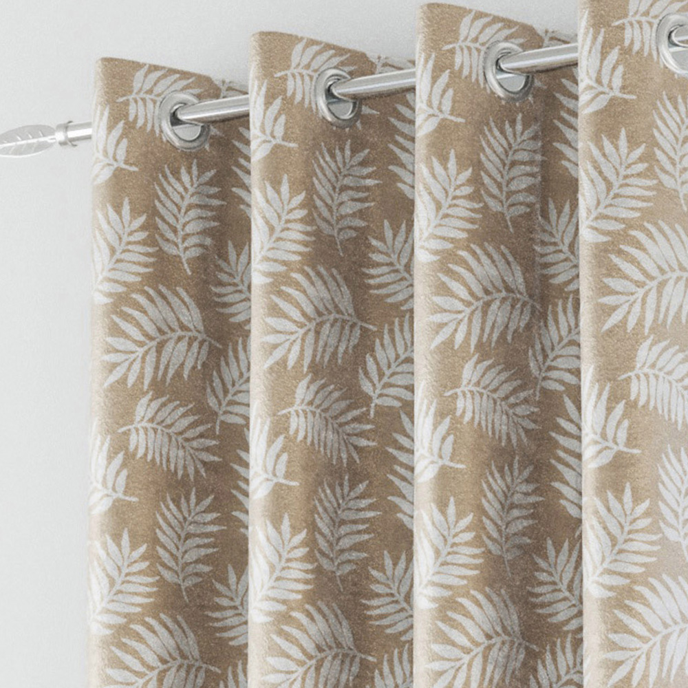 Transform your living space with the Enhanced Living Oakland Latte Leaf Print Blackout Eyelet Thermal Noise Reducing Curtains 229 x 183cm, designed to combine modern elegance with practical functionality. Featuring a stylish eyelet header for easy hanging and smooth operation, these ready-made curtains are adorned with a sophisticated all-over leaf print. The triple weave technology fabric, with its three interwoven layers, includes a central black thread. It blocks up to 85% of incoming light and insulates against cold air, eliminating the need for a separate lining and ensuring a soft, elegant drape. These curtains not only enhance sleep quality and overall well-being by reducing light and noise but also contribute to energy savings by keeping your space cooler in summer and warmer in winter. Effortless installation and operation, make them an ideal choice for adding a touch of refinement to your home.