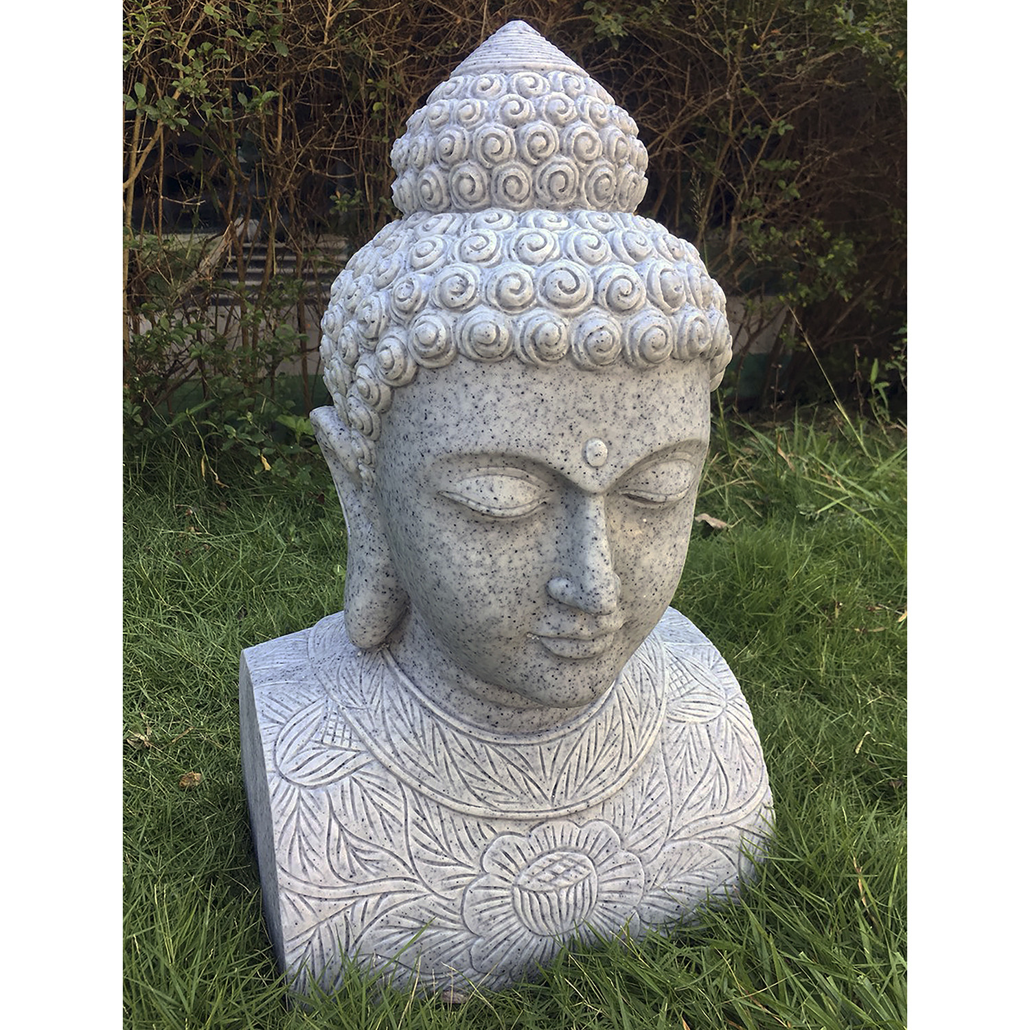 This Champa Head Bust is made from luxury crushed marble mixed with durable, weather-resistant resin. Inspired by the historical Champa Princess, this head features a beautifully carved face with eyes closed in a serene expression, as well as elongated earlobes to signify the Princess' statues. There is intricate detail across the base of the bust, mimicking ornate clothing, as her hair is designed as tight curls styled into a point. This incredible ornament will bring both elegance and peace to your garden, creating a focal point in your decor.