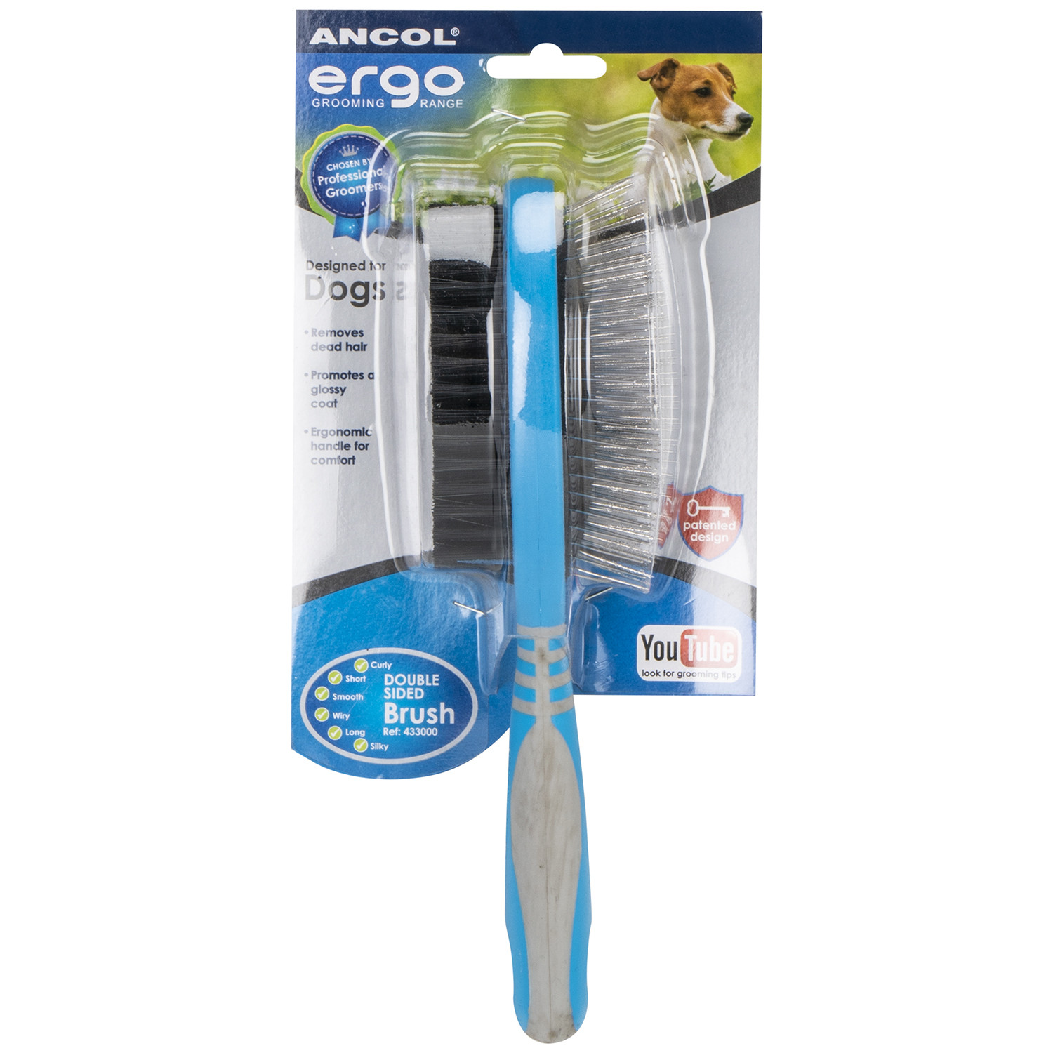 Help keep your dog's coat clean and healthy with the Ergo Double Sided Brush. This versatile brush designed to gently tease out the undercoat with the pin cushion side, whilst the bristle brush will catch the loose hairs on the upper coat. The ergonomically designed handle ensures maximum comfort for both you and your furry friend during brushing.