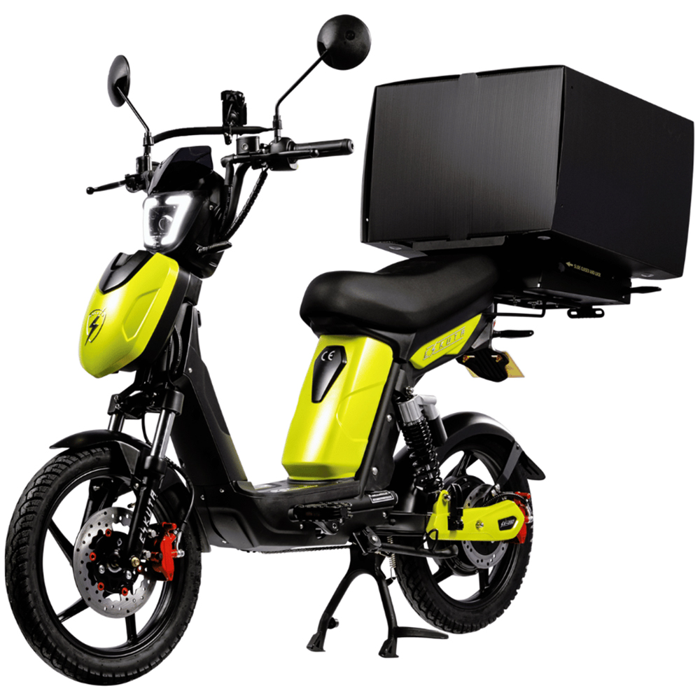 Travel in style with the Eskuta SX-250 Cargo Matte Acid Yellow Electric Bike 48V. Engineered with the robustness of a motorcycle, this electric bike is designed to conquer all weather conditions, ensuring your deliveries are made without compromise. With its spacious 106L storage box, sliding delivery rack, and tech bar for your navigation device, the bike is the ultimate choice for delivering a wide range of items, from plumbing and electrical supplies to food and tools. Crafted with unparalleled styling and cutting-edge technology, the bike boasts an impressive range of 40-50 miles on a single seven-hour charge (Battery range figures are quoted as an average and subject to conditions, gradient, and rider weight). The bike features a sturdy electroplated lightweight steel frame, impact-resistant body panels, a digital speedometer, and a power level indicator. Its pedal assist system ensures compliance with regulations, while the 18 inch alloy wheels with reinforced tubeless road tires provide a smooth and reliable ride. Backed by a 12-month warranty or up to 8,000 miles of use, the bike exemplifies its commitment to innovation, performance, and sustainable mobility. Plus, the white glove delivery service ensures that you receive a comprehensive handover, making sure you're confident in your purchase.