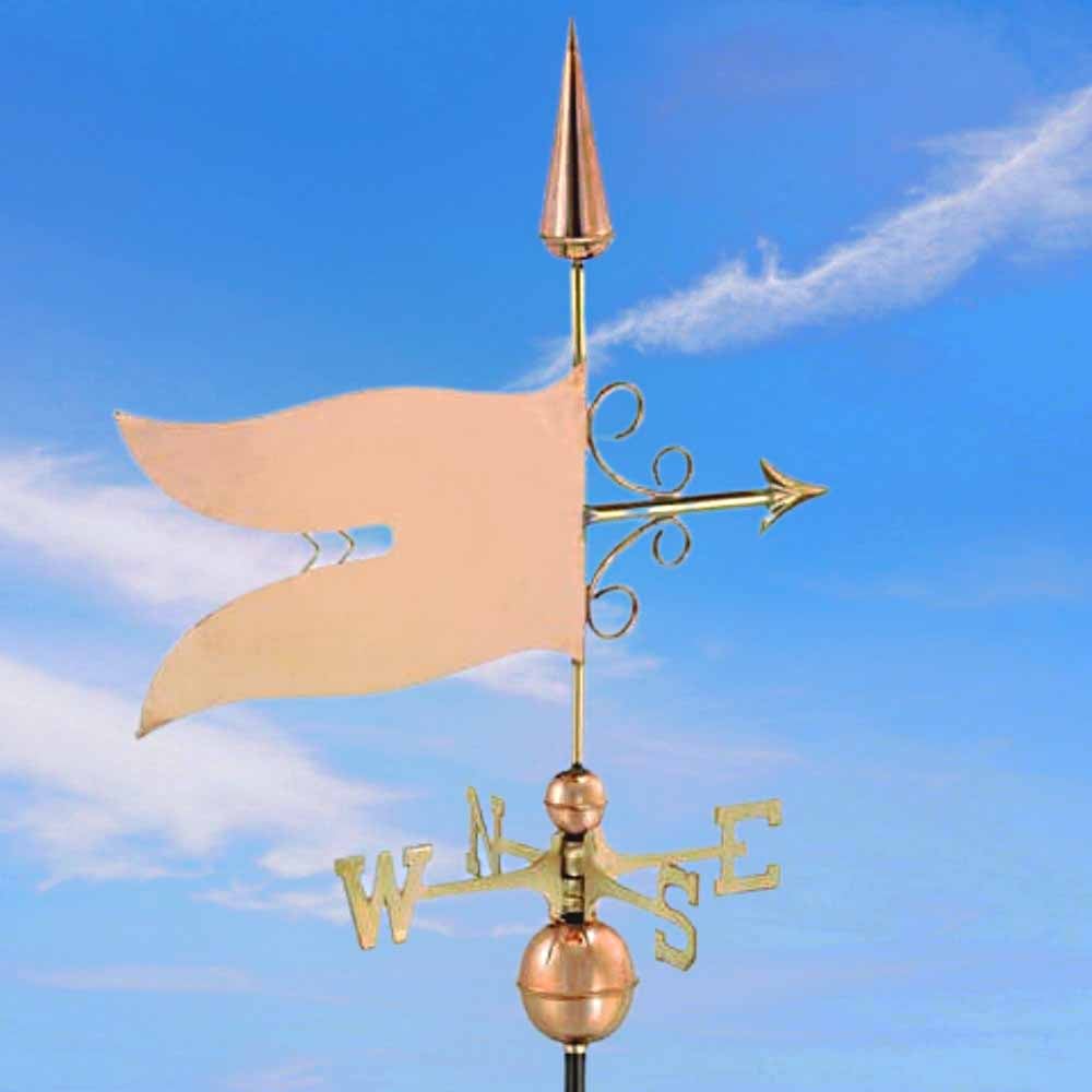 Weather patterns have long been predicted using the direction of the wind, and for centuries, weathervanes have been used for this purpose. This simple and classic design of a banner weathervane will add an elegant touch to any home. A conical pinnacle adorns the top of this stylish head. This quality Weathervane has been handcrafted in copper with a brass directional arrow and is ideal for mounting on most homes and outbuildings. The Banner Weathervane comes complete with cast brass cardinal points, has copper separation balls, and a black powder-coated steel mounting rod and angled eave bracket. Approximate dimensions: Banner: 6cm wide x 64cm long x 58.5cm high. Cardinal points: 34cm long x 6cm high. Overall: 44cm wide x 104cm high.