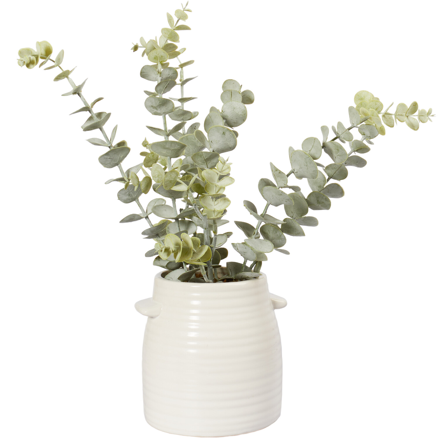 The Eucalyptus in Ceramic Pot creates a natural aesthetic in your home without the effort and upkeep of wild plants. This artificial floristry is highly detailed and features a gorgeous array of green tones to bring an authentic feel to this plastic eucalyptus. The foliage is set in a white ceramic pot that is easy to coordinate in your home and will look wonderful sitting on accent tables, shelves, and mantelpieces.